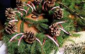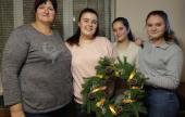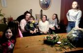 A foglalkozás szombaton délután három órakor, a Szent Család karitászházban vette kezdetét, ahol adventi koszorúkat és más karácsonyi dekorációkat készítettünk. A karitászvezető Ruszányuk Zsuzsa néni meleg teával, szalagokkal, díszekkel, kézműves eszközökkel és karácsonyi zenékkel várta a kicsi és nagy gyerekeket. Tőle kaptuk a helyet és minden nyersanyagot. Karácsonyi énekekkel és vidám beszélgetéssel hangolódtunk. Végül kezdetét vette a munka. Hiába szúrtak a tűlevelek, a kicsik elszánt lelkesedésessel készítették az ajtódíszeket.