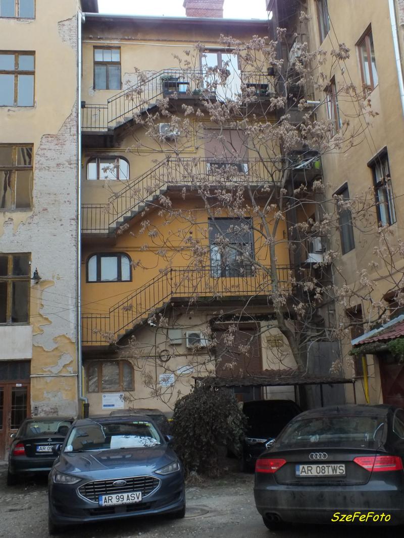 A városi palota éppen ezért épült fel Andrényi pezsgőgyáros szecessziós palotája és az Arad-Csanádi Egyesült Vasutak (erre még később vissza fogunk térni) eklektikus stílusú székháza közé. Ezeknek az épületeknek a mai állapota enyhén szólva is elkeserítő... Semmi látható nem utal egykori dicsőséges múltjukra... A házasság napján a menyegzői házat "illő módon" feldíszítették, majd az emeleten megrendezett polgári esküvő után innen indult el a hosszú lovaskocsi menet a Deák utcai református templomba. (Lásd a fönt hivatkozott beszámolómban.)