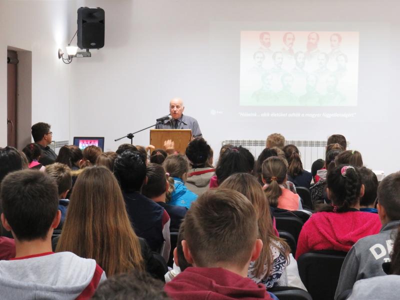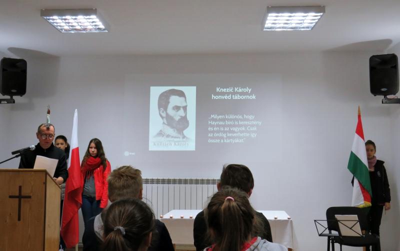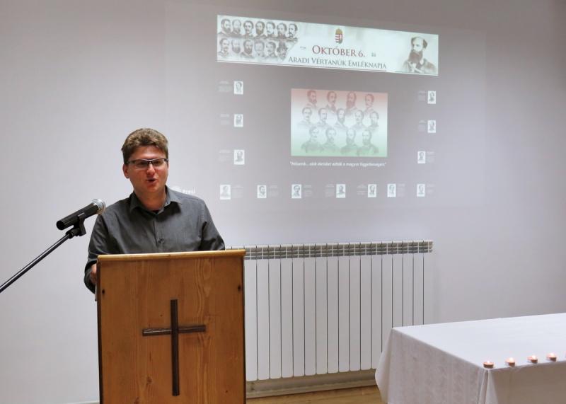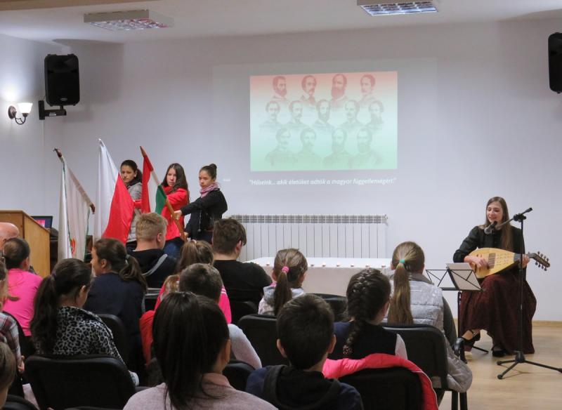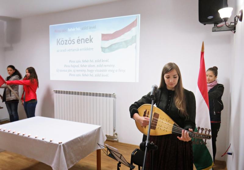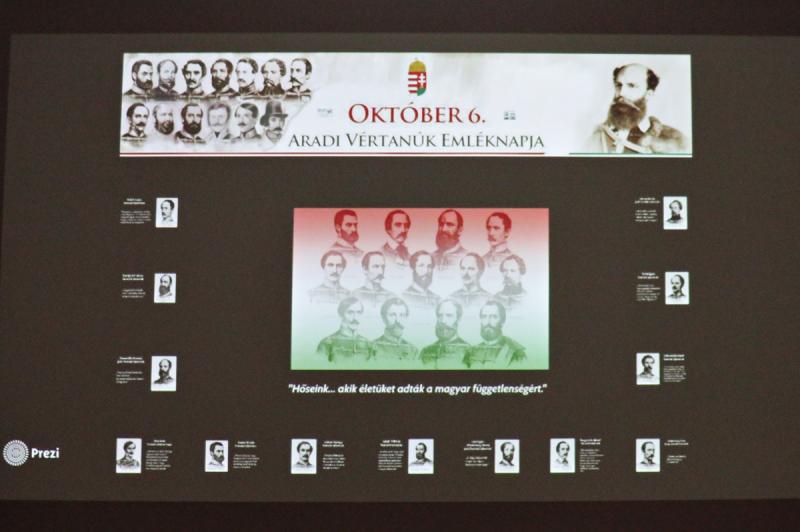 Az aradi vértanúk tiszteletére 2017. október 6-án emlékműsort tartottunk a Szilágysomlyói Római Katolikus Plébánia Közösségi Házában. A rendezvény főszervezői között volt mentorom, Józsa Nándor Lóránd hittantanár, Erdei János földrajz és történelem szakos tanár úr, illetve én, Garamvölgyi Anett ösztöndíjas, népi ének és hangszertanár. Célcsoportunkba a helyi magyar nyelvű Báthory István Általános Iskola 5-8. osztályai kerültek. Számukra rendeztünk egy közel teljes órás, hitéleti gondolatokat, történelmi előadásokat, vetítést és énekeket tartalmazó megemlékezést. Úgy érzem, programunk elérte célját, mert sikerült közelebb hoznunk az aradi vértanúk történetét a mai generációhoz és velük közösen méltó módon emlékeztünk meg bátor őseinkről, akik nem féltek életüket adni a hazáért.