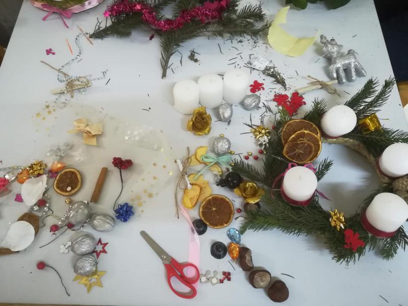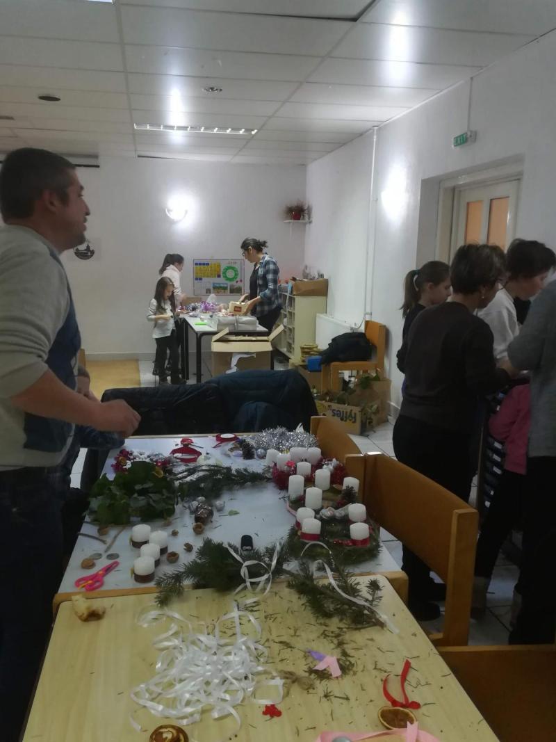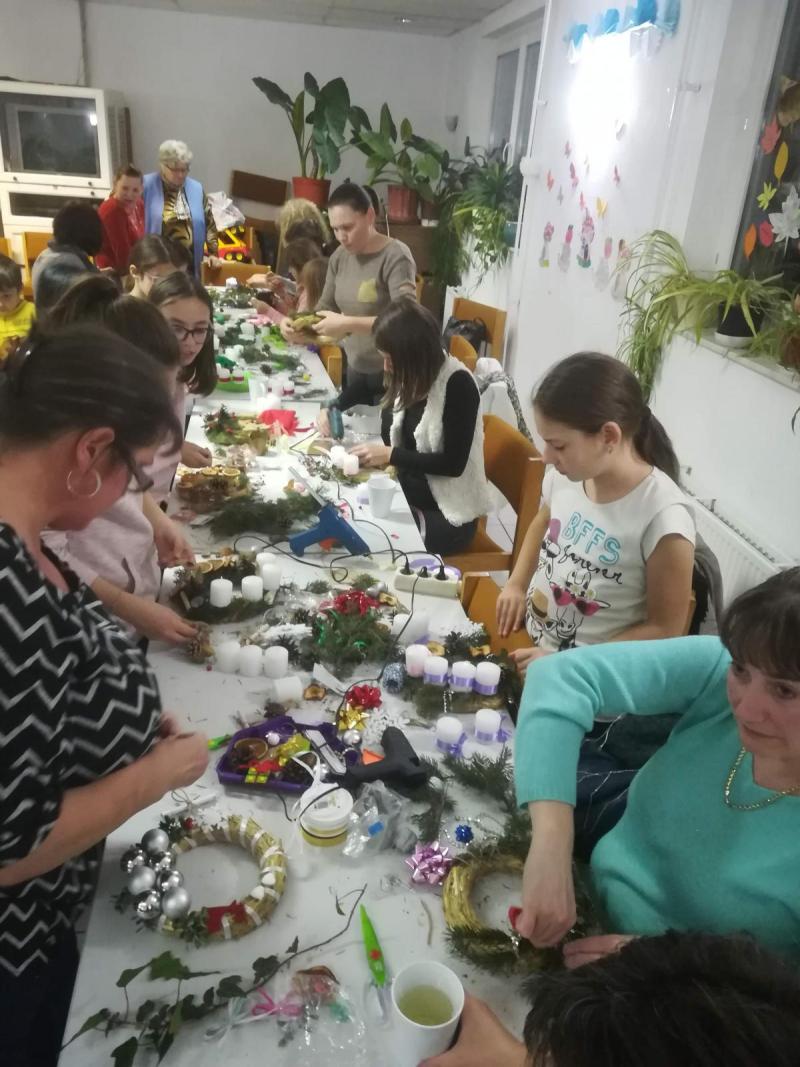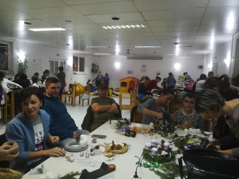 Kőhalomban egy esti, baráti összejövetelen a gyermekek szüleikkel együtt adventi koszorút készítettek november 27-én. Nagy egyeztetéssel kezdődött az este, hiszen minden családtagnak megvolt a véleménye, hogy milyen színű és milyen stílusú legyen a koszorú. Miután sikerült az összes elképzelést egésszé formálni, nekiláttak a munkának. Volt ott zsíros kenyér, meleg tea, karácsonyi zene, apa, anya, barátok... minden, ami egy jó estéhez kell. Családonként két koszorút készítettek, az egyiket hazavihették, hogy vasárnap meggyújtsák rajta az első gyertyát, a másikat pedig ott hagyták, s az egyházközségben megrendezett karácsonyi vásárban értékesítették azt a napközis foglalkozások javára. Nagy kincs, amikor a család együtt töltheti az időt, s ha mindezt a nagyobb közösségben teszik, az élmény még különlegesebb.