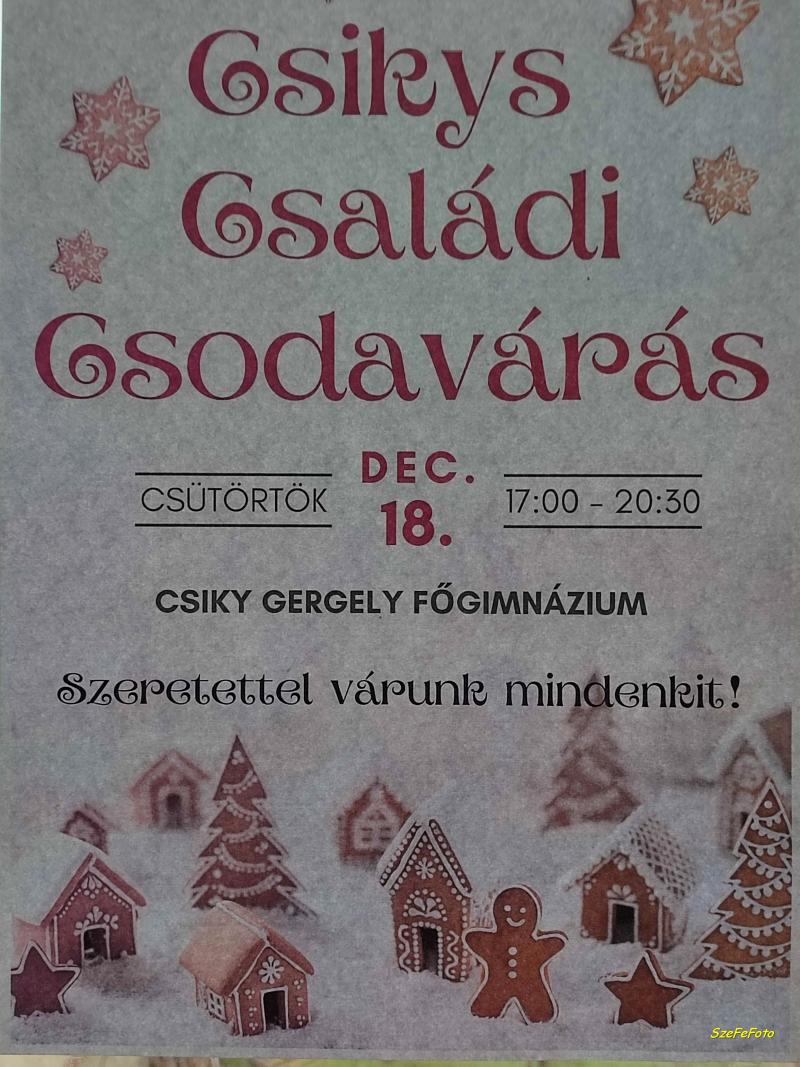A címben jelzett, immár tradícióval rendelkező programra december 18.-án került sor az aradi Csiky Gergely Főgimnáziumban, ahol a gyerekek, szülők és tanárok közösen szórakozhattak (a) karácsonyi hangulatban, várván a karácsnyi csodákat, amik valójában a szívekbe jönnek el, ha őszinte odafordulással közelítünk ezekhez a(z önmagukban is) lenyűgöző káprázatokhoz... Volt itt minden, ami "szem-szájnak ingere" (a tobzódás forgataga okán a teljesség igénye nélkül): a vendégeket fogadó élő betlehem, szabadulószoba, kvízszoba, relaxációs helyiség, diavetítés, labirintus, arcfestés, tombolda, retro-szoba, mézeskalács-díszítés, szappanöntés, kézműves-foglalkozás, jótékonysági-vásárok, emlékfotózkodás, iskolai zenekar, "csodaváró vendéglő", etc... A program az iskola épületében 17 órától este fél 9-ig tartott.