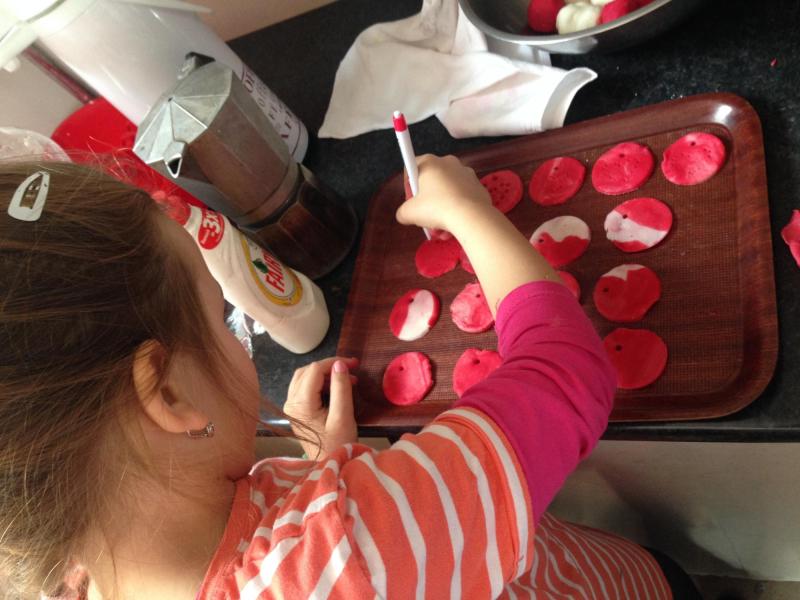A gyerekek megismertettek a márciuskával, a tradicionális román népszokással, mely a tavasz váráshoz kötődik (lásd korábbi cikkeinket: Máricuska; Tiszán innen, Dunán túl...).. Március 1-jén a férfiak úgynevezett márciuskákat ajándékoznak a nőknek. A mára már gesztussá vált ajándékozás minket is megihletett. Sütöttünk muffint pirosat és fehéret, készítettünk karkötőt és kis díszeket. A fehér/piros színkombináció a szerencse, az öröm, a szeretet vagy a szerelem jelképei. A piros szín a tavaszt, a fehér a telet szimbolizálja. A márciuska díszeinket a gyerekek továbbfejlesztették, így március 1-jén mindegyikük saját készítésű ajándékkal lepte meg családtagjait.