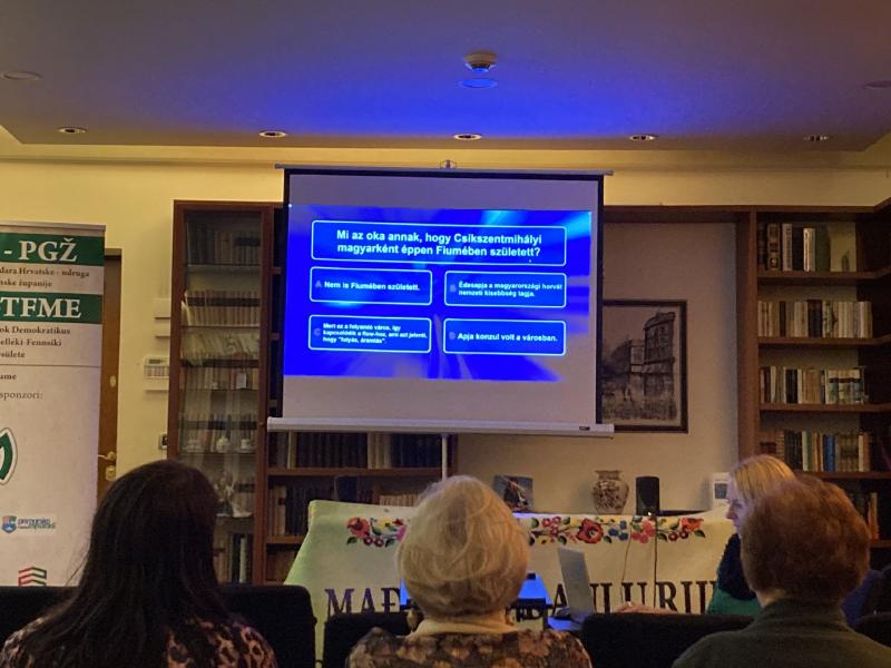 Tomcsányi Zsófia, a Petőfi program ösztöndíjasa meghívására október 25. és 27. között Fiumébe látogattam. Az első nap során megismerkedtem a helyi magyar közösséggel, és részt vehettem Csíkszentmihályi Mihályról, a fiumei születésű híres magyarról szóló film, a Flow-Áramlat vetítésén. Ezen kívül a Muravidéki Magyar Önkormányzati Nemzeti Közösség által ajándékozott gyermekkönyveket is átadhattam az impozáns Anna-villában a helyi közösség vezetőjének.