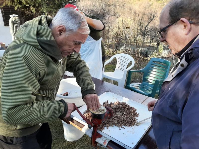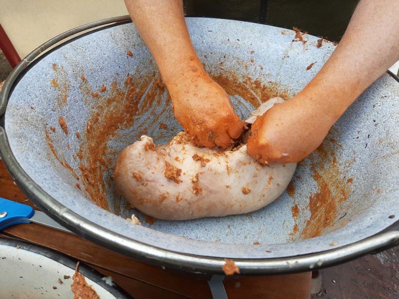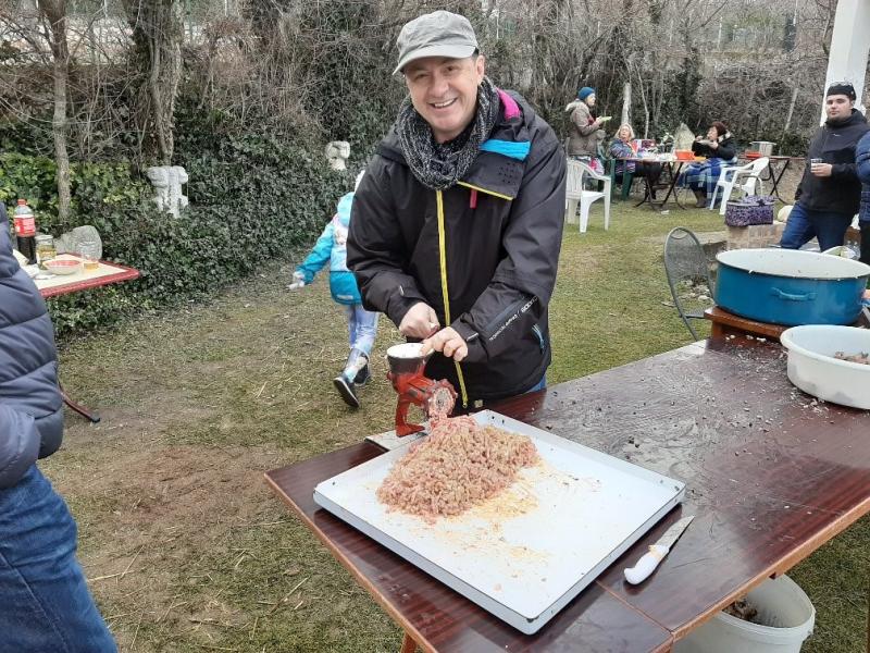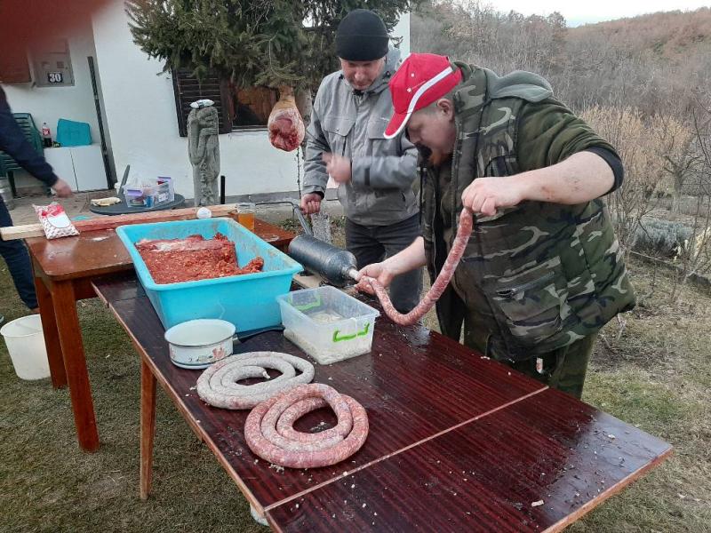 A Teleház tagjai és a magyar külképviselet dolgozói már korán reggel gyülekeztek, hogy nekilássanak a munkának. Hagyományosan reggelire sült vér készült, majd egy-egy zamatos pálinka után a rengeteg feladat szétosztása következett. Sokan bekapcsolódtak a munkába, így a nap végére el is készült a hurka, kolbász, abált szalonna, disznósajt (avagy svargli), kisült a töpörtyű, és mindenki egy kicsit megtanulta valamelyik folyamat csínját-bínját. Néhány gyerek is sertepertélt a felnőttek körül. Hol az udvaron, hol a házból hallatszott vidám kacagásuk. A résztvevők nem csak a munkát osztották el, de az elkészült falatokat is, így az emléken felül is mindenki hazavihetett egy-egy adagot a magyaros finomságokból. Így zajlott az első macedóniai magyar disznóvágás.