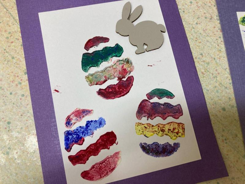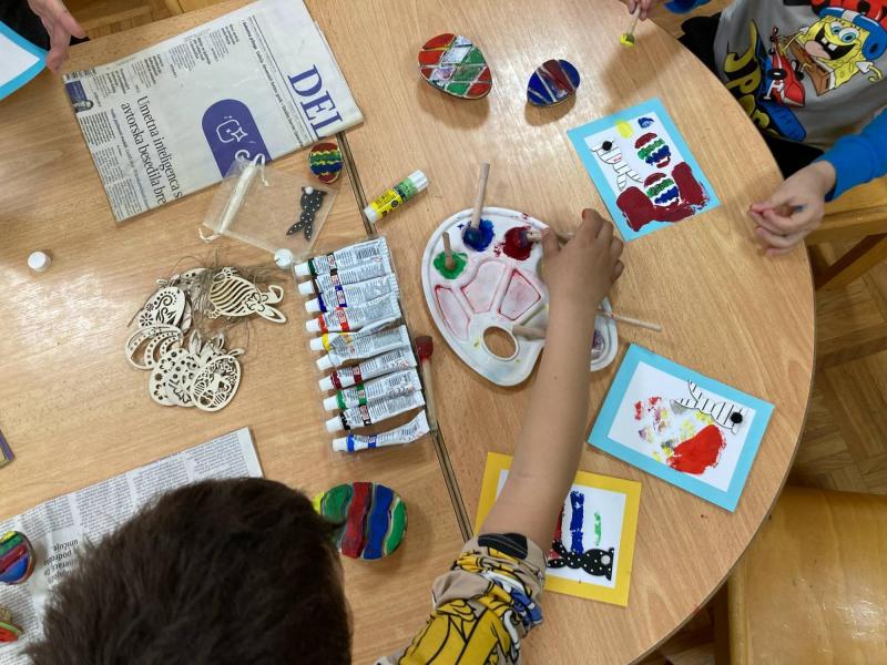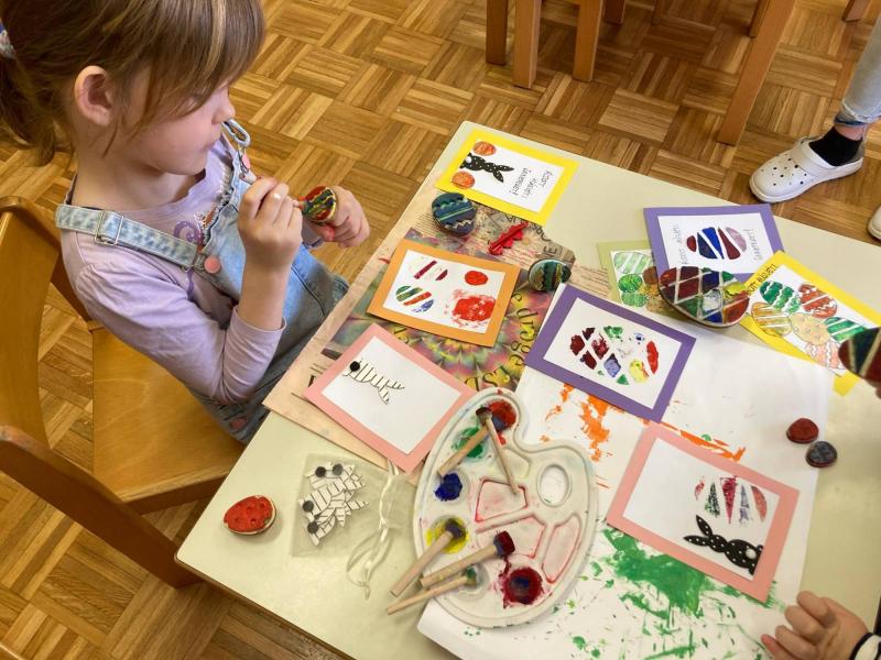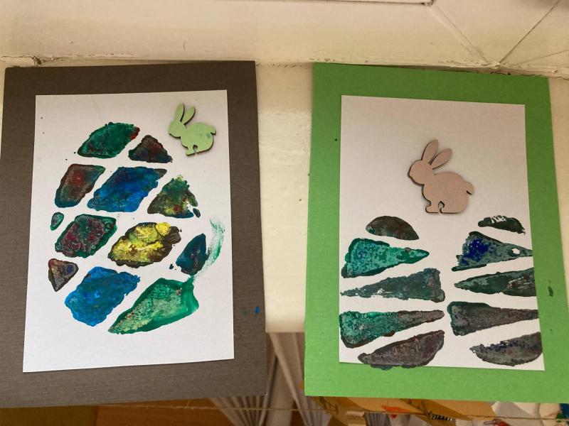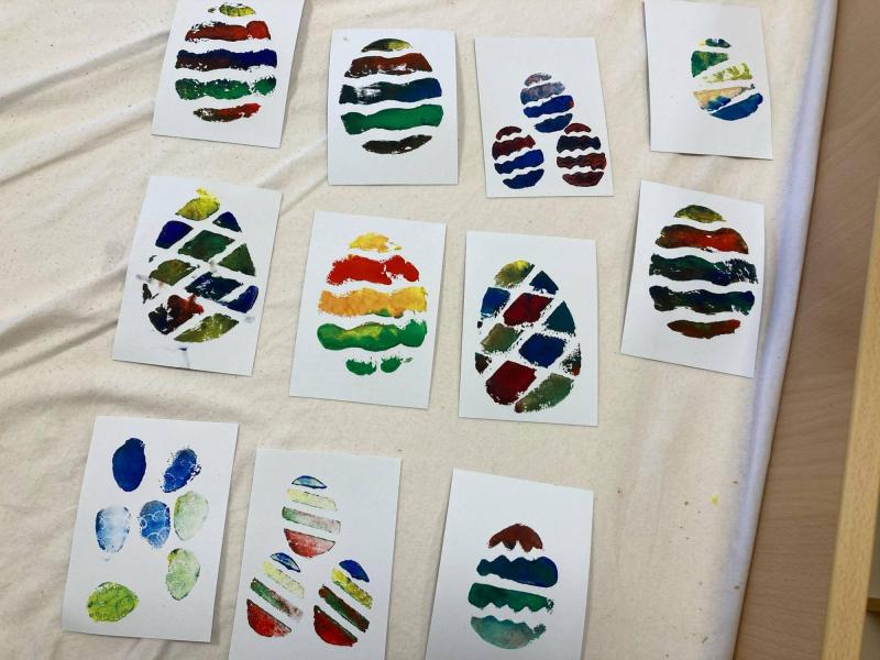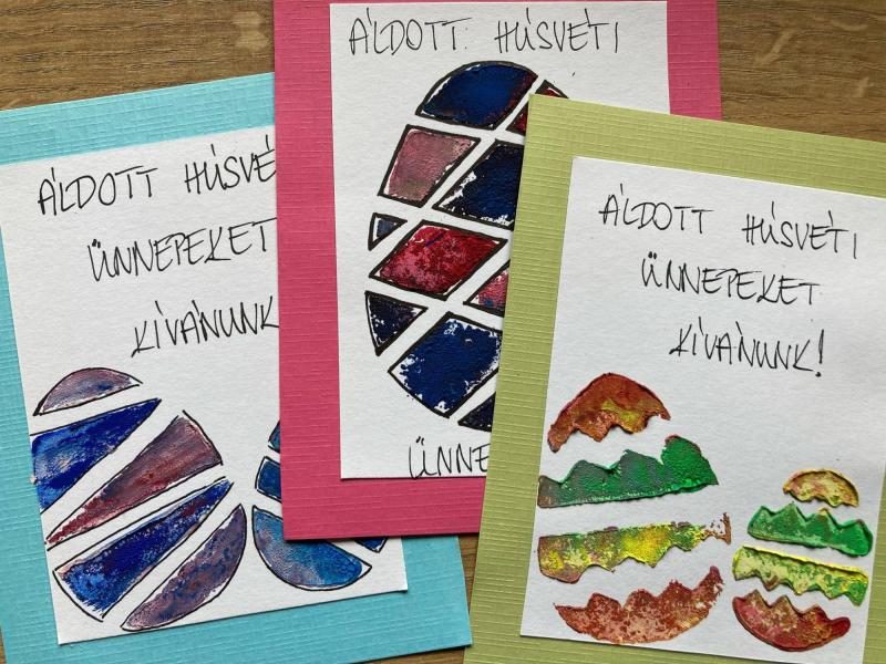 A program végén mindenhol húsvéti képeslapokat készítettünk. Eredetileg krumplinyomdázást terveztem, de mivel élelmiszert nem vihettem az intézményekbe, alternatív megoldást találtam: fából és dekor gumiból készítettem a nyomdát, a fogantyút pedig parafadugóból. A gyerekek nagyon élvezték, hogy színes, egyedi mintákat készíthettek a képeslapokra.