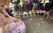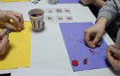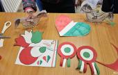 Mikor elfogytak a kivágáshoz megrajzolt tulipánok, a csapat a teremben egy csomagoló papírra előre megrajzolt, a táblára mágnessel rögzített kokárda sablon kiszínezésének állt neki. Piros, fehér és zöld színű bőrbarát festékekkel megfesthették egymás tenyerét, ezt követően kerülhettek fel a kokárda színeit adó tenyérnyomatok a táblán rögzített papírra.