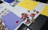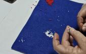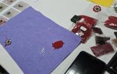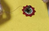 Azonban a tananyag mintájának befejezését a kokárdák elkészítéséhez ők is némi kitérővel vették. A vezetésemmel egy cseppet nehezebb úton, hiszen a gyöngyfűzött kokárdákat a filc alapra egyetlen gyöngyszemmel történő rögzítésük helyett a minta alapját, közepét adó kétlyukú, úgynevezett superduo gyöngyök közé fűzhettek egy kis zöld csiszolt gyöngyöt, ezzel díszítve a minta belsejét. Végül pedig közvetlenül a fűzött kokárdáikra varrhatták rá a kitűző alapokat.
