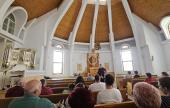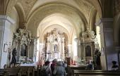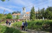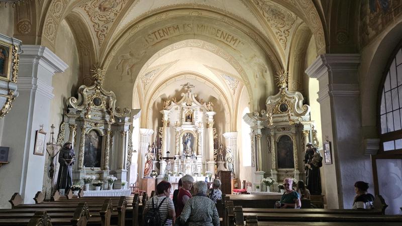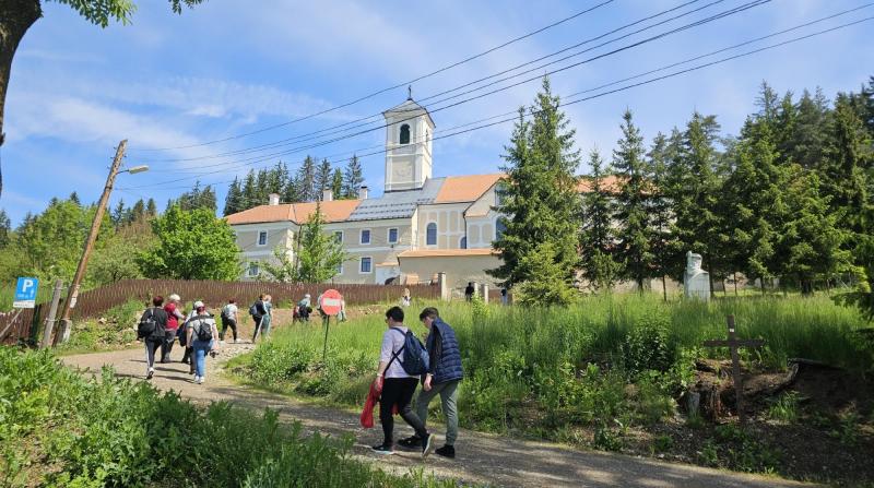 A kastély után a település északi része felé haladva, a zöldellő fákban, virágzó mezőkben és egy szoborparkban gyönyörködve, hangulatos sétával felkerestük a Ferenc-rendi kolostor templomát is, amely egyszerűségével és békés légkörével szép ellenpontja volt a kastélynak és a ditrói templom élményének.