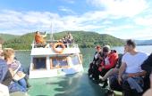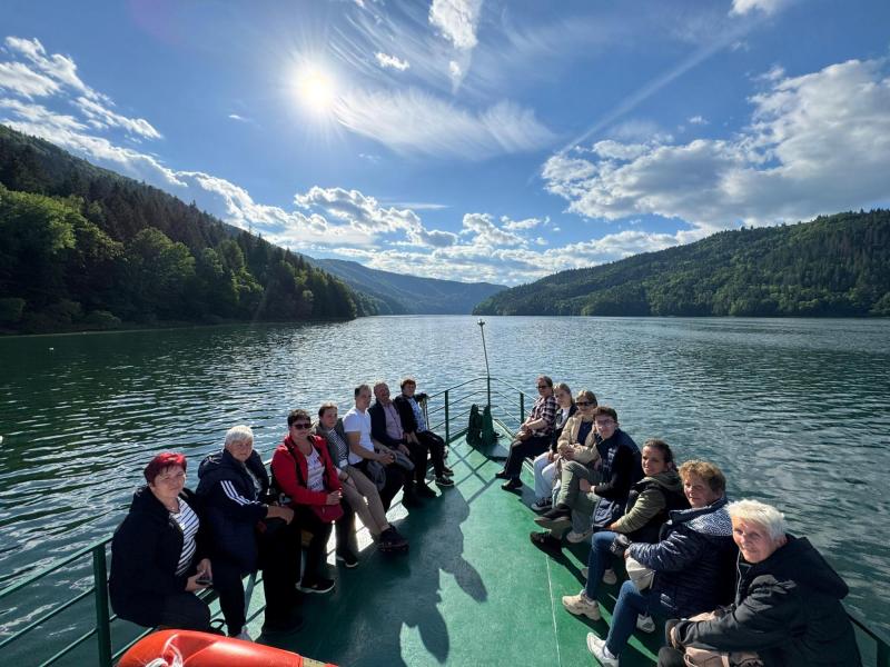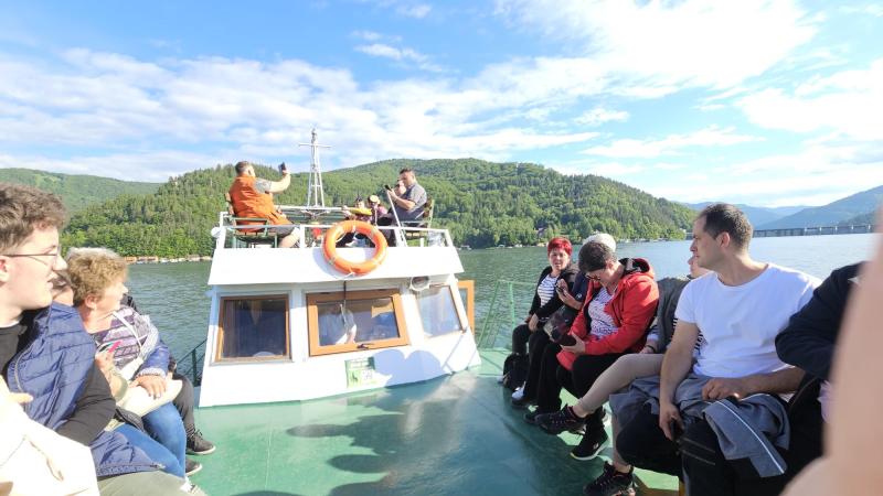 A szorosból kiérve a Békási-víztározó felé vettük az irányt, ahol a kirándulásunk szerves részeként közösen hajóra szálltunk, majd egy mintegy félórás hajókirándulás során gyönyörködhettünk a hatalmas tó kékjében, az esős napok után megérkezett, melengető napsütésben, és a tavat minden irányból körülölelő, a vízfelszínről is visszatükröződő, sűrű erdőkkel borított hegyek látványában. A tó békéje és a zöldellő hegyek látványa szép levezetése volt a nap élményeinek.