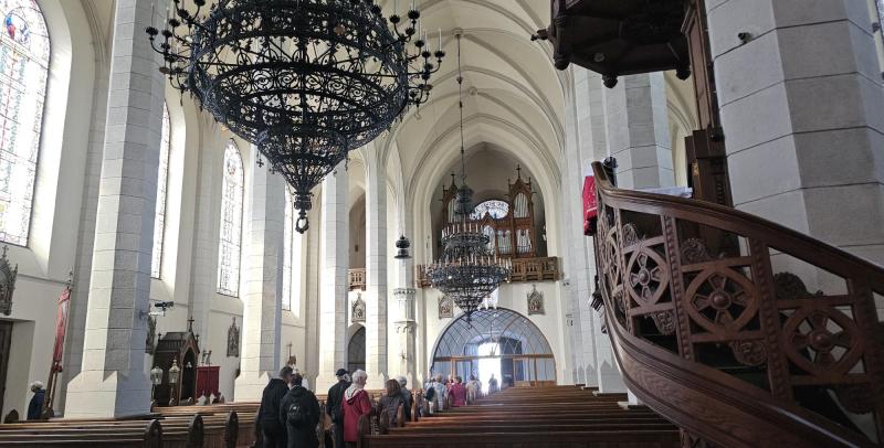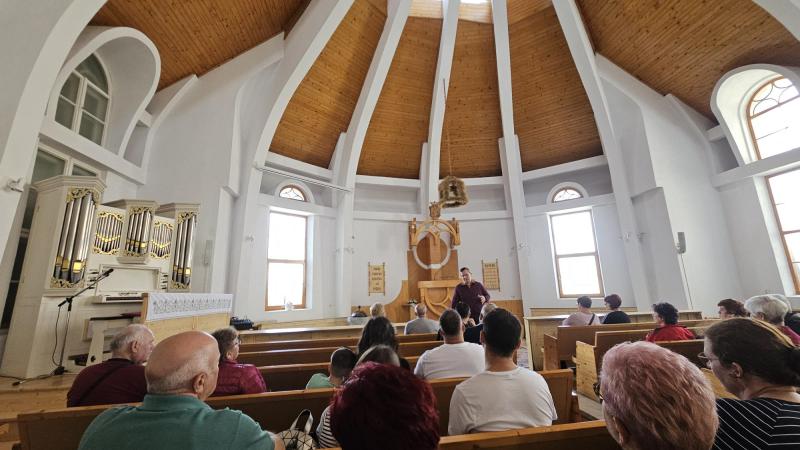 Következő állomásunk Gyergyószentmiklós volt. Itt elsőként a helyi református templomot látogattuk meg, ahol a gyülekezet lelkipásztora fogadott bennünket, majd mesélt nekünk a templom történetéről, a gyergyói református gyülekezet életéről, végül egy zsoltár közös eléneklésével búcsúztunk.