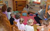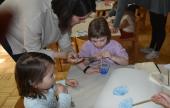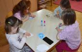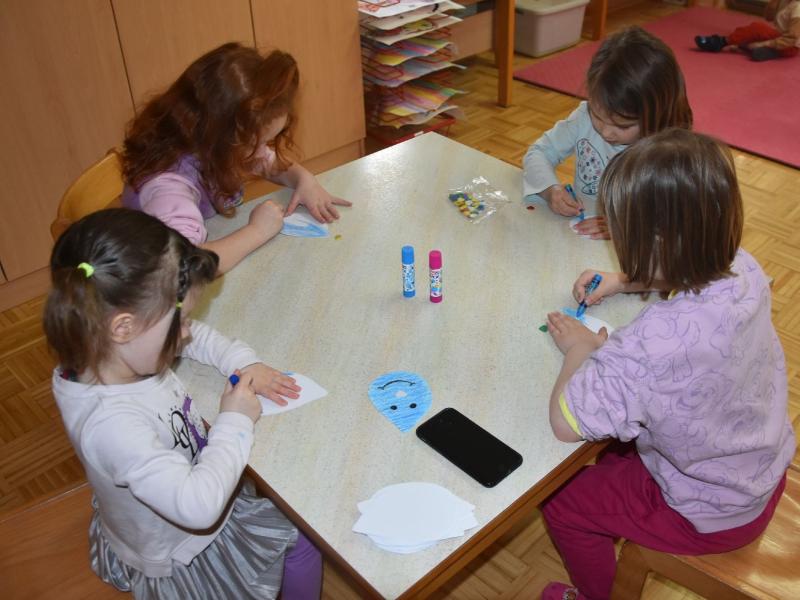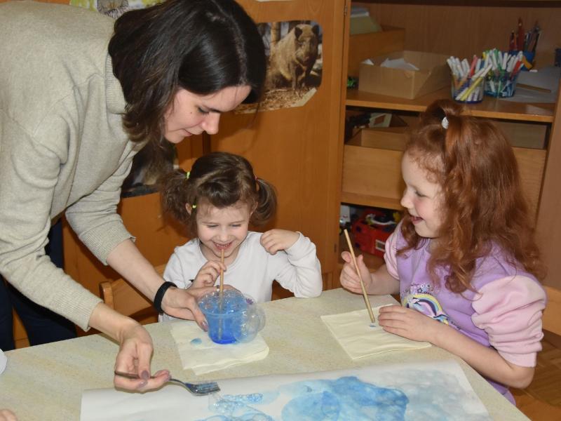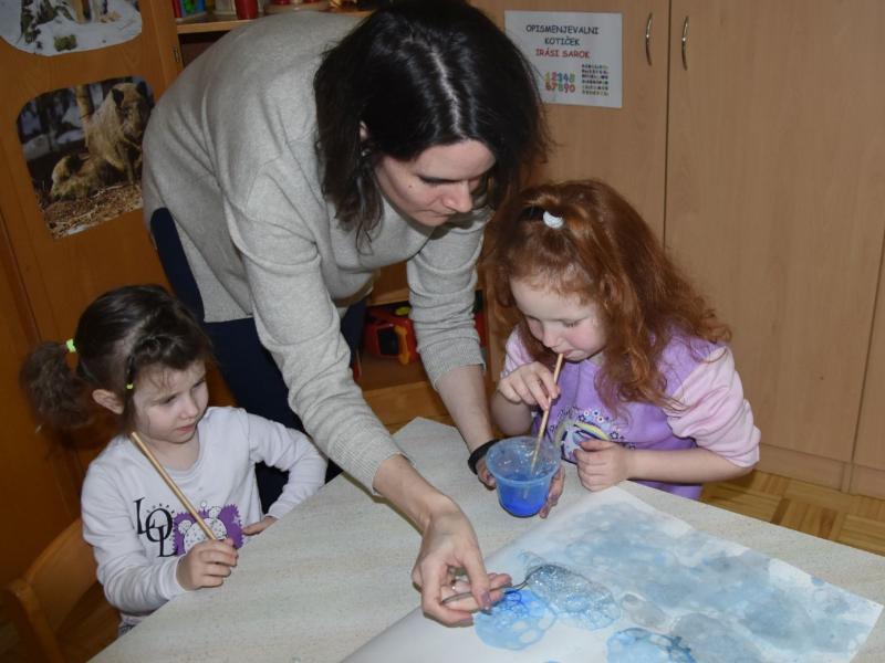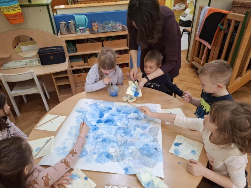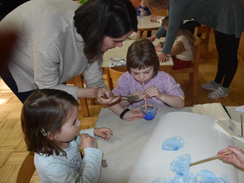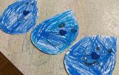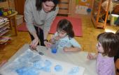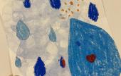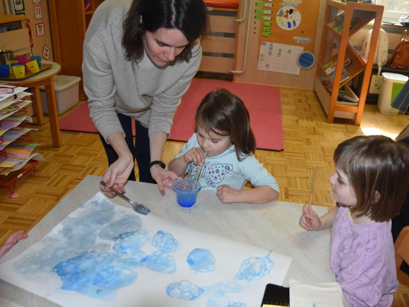Majd mondókáztunk (Ess eső, ess, holnap délig ess...) és énekeltek (Csepp, csepp, csepereg...), végül a nagyobbakkal megszínezett szappanos vízből buborékokat fújtunk és csodás lapokat festettünk, a kisebbekkel pedig vízcseppeket alkottunk és színeztünk. E két végterméket végül több óvodában is egy közös alkotássá formáltuk.
