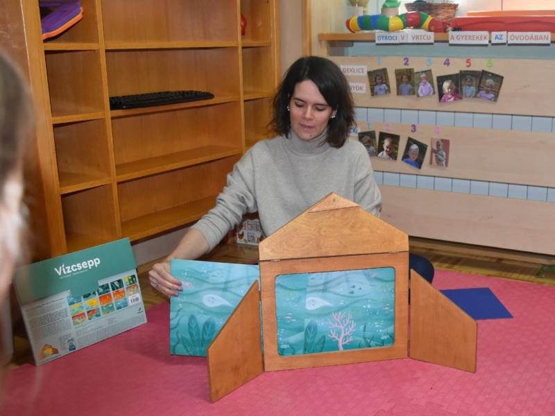 A foglalkozásomat mindenhol a Vízcsepp papírszínház mesével kezdtem. Egy csepp „életútját” mutatja be a történet, a folyótól kezdve a harmaton, párán, esőn keresztül. Ezután átbeszéltük még egyszer kis vízcseppünk útját és a víz egyszerűsített körforgását.