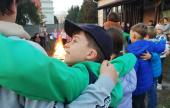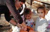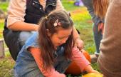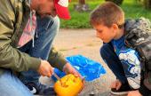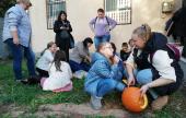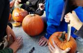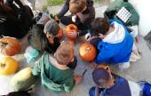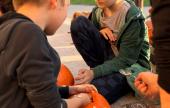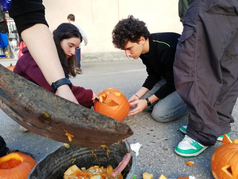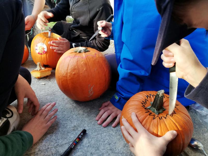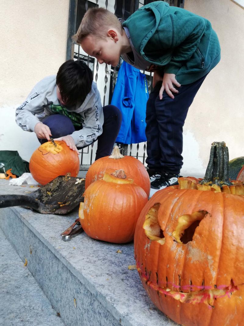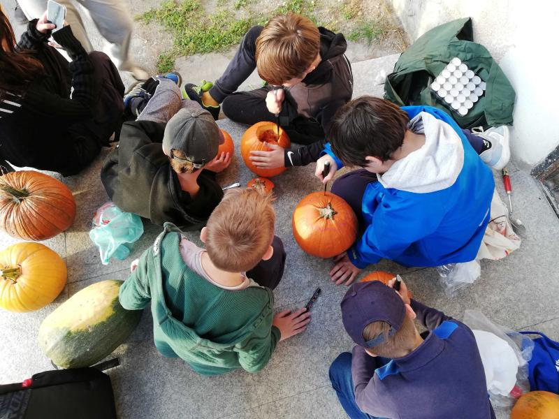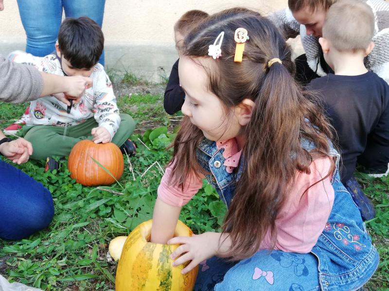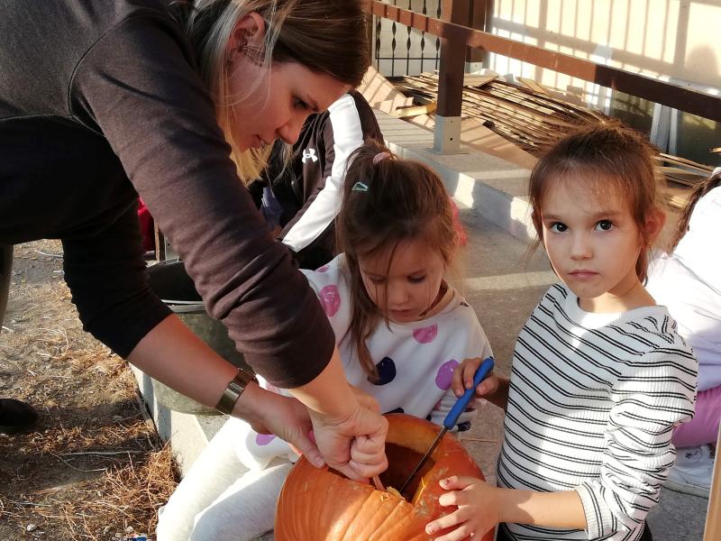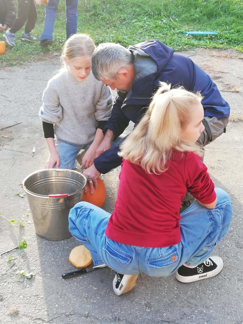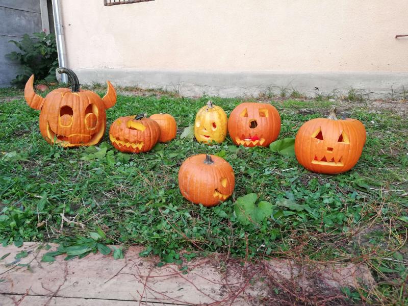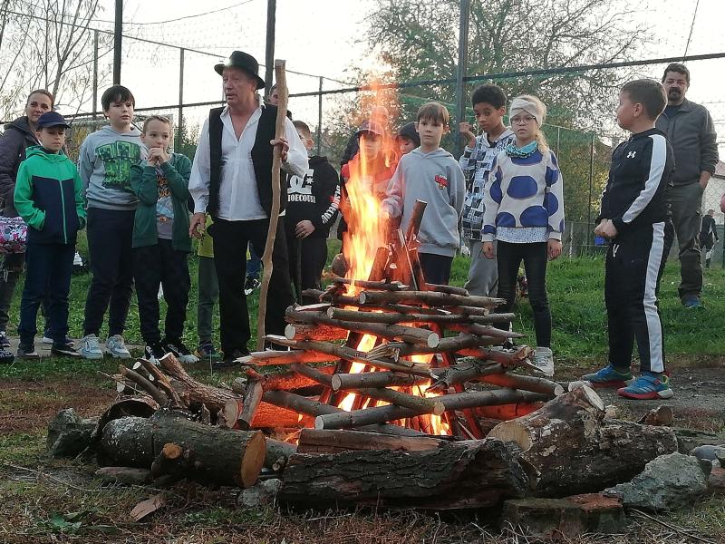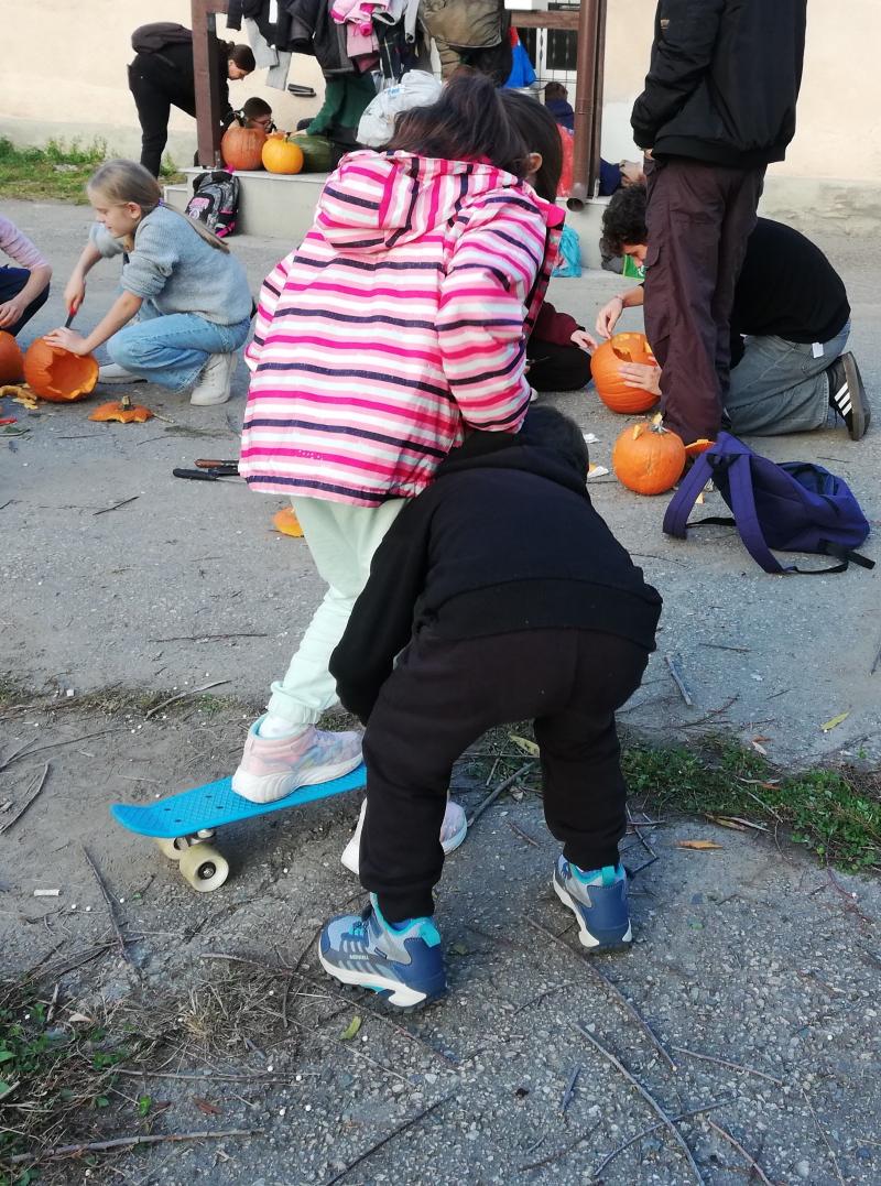 Kés, villa, olló, gyerek kezébe nem való! Mégis… 2025. október 23-án a dévai Magyar Ház udvarán engedélyt kaptak, hogy kést ragadjanak. De, előtte, míg gyűltek… Zsannal és Attilával (két öreg cserkésszel) körbeálltak, énekeltek, ismerkedtek, játszottak. Aztán kezdődött a faragás. Készült csíkos, világos-és sötét narancs, füles macska-töklámpás… klasszikus háromszögszemű, háromszögorral, fog nélkül és fogakkal, nagy mosollyal (vagy vicsorral). A belét kanállal, kézzel… örömmel kimerték. A lámpásokat, amint lement a nap, itt-ott, útmutatásul kihelyezték. Időközben a nagy tűz, meseország fénye kihunyófélben… A gyerekek bőszen jelentkeztek, ők felélesztik a tüzet. 5 fős csapatokban elindultak a szomszédos katolikus templom udvarába, hogy fát szerezzenek. Útközben találkoztak Hófehérkével (akinek az alapanyagok kiválasztásában segítettek, hogy főzhessen vacsorát a törpöknek), a lesántult Piroskával (akitől kosarát elvették, és a fonál -akadálypályán át, kézről-kézre adogatva egész a nagymamáig vitték). A mamánál farkas helyett sárkány... Karmaiból megmenekültek... A tündérkeresztanyák odújáig szöktek (Itt színes bájitalt kevertek). Odébb, sárga gumicsizmás punk kandúr már várta őket. A „macskának” a nagyobbak dalt írtak, a kisebbek énekeltek. Továbbmentek. Mesebirodalom kapuja előtt... A földön, rongyai közt, kártyái fölött kuporgott a hajléktalanná lett király. Nincs mese, neki is segíteni kell! A botokat tettükért megkapták, mind az összeset a tűzre dobták. Újra lobog a láng! Újra pezseg a tűz, feléledt a varázs! (Lehet majszolni a zsíros kenyeret, inni a meleg teát.)