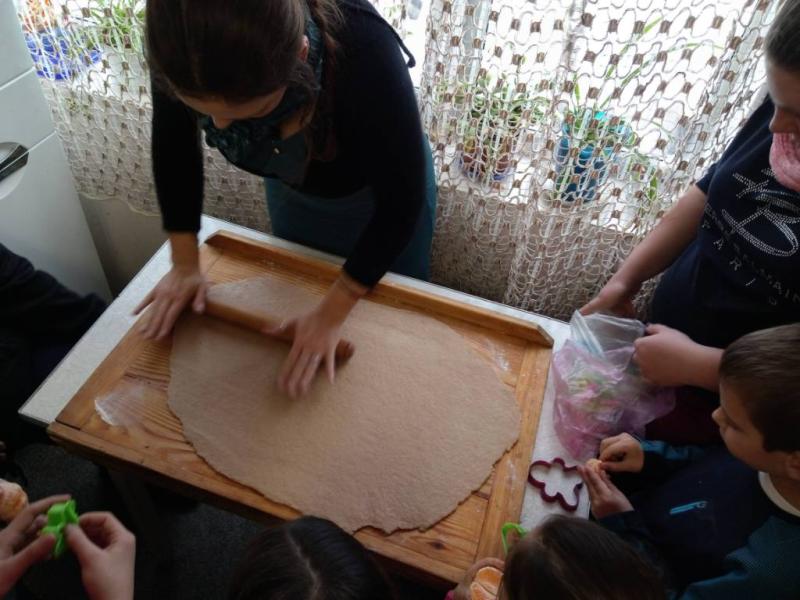 Advent harmadik vasárnapján, közkívánatra 5 kiló lisztből készítettünk mézeskalácsot az aknaszlatinai Szent Család karitászházban. Kicsik és nagyok sürögtek forogtak a konyhában. Volt, akit az édesanyja kísért el a sütögetésre, de kedvet kapott és maradt segíteni.
