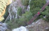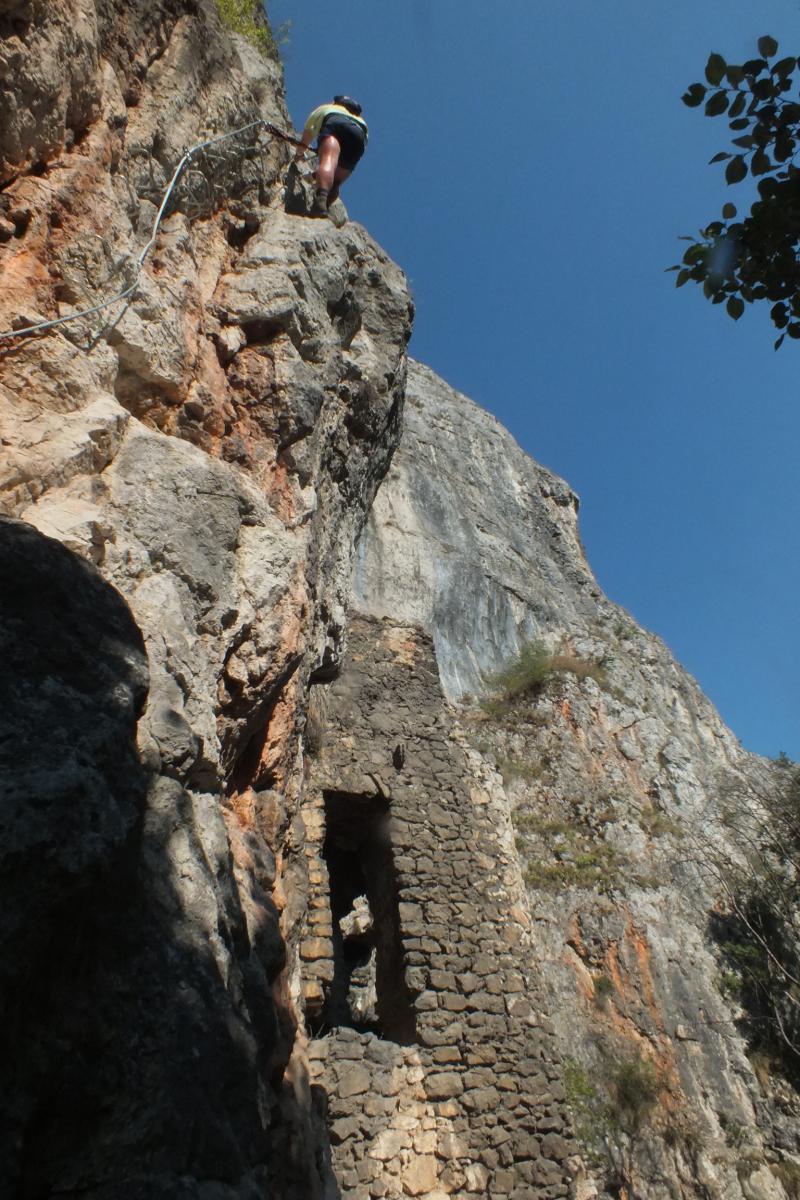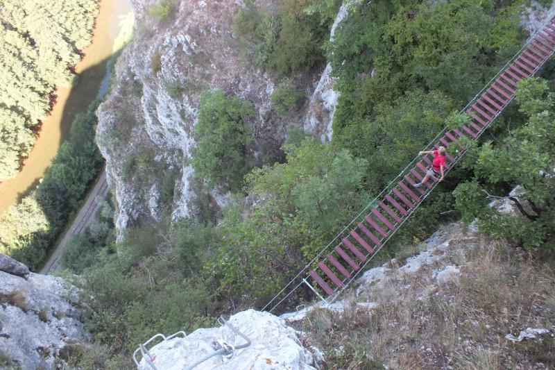 A helyi információs tábla szerint a ferrata egy XIII.sz.-i rom közelében indul a "Sárkány háza"(?) nevű barlang bejárata mellől. (A bejárat mellett jól látható a XIII. században épült őrtorony amit a tutajokon történő árumozgás ellenőrzésére építettek. A 95 m hosszú barlangnak egy enyhén emelkedő terme van, amelyben néhány sziklakád és egy patak látható. Kb. 20 m után a terem egy, enyhén díszített szűk, 50 méteres járattal folytatódik.) A ferrata-útban több függőleges és áthajló szakasz is található, a végén egy 25 m hosszú függőhíddal. Kezdőknek a szomszédos (Sonkolyos felé eső) ferrátát javaslom.