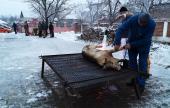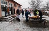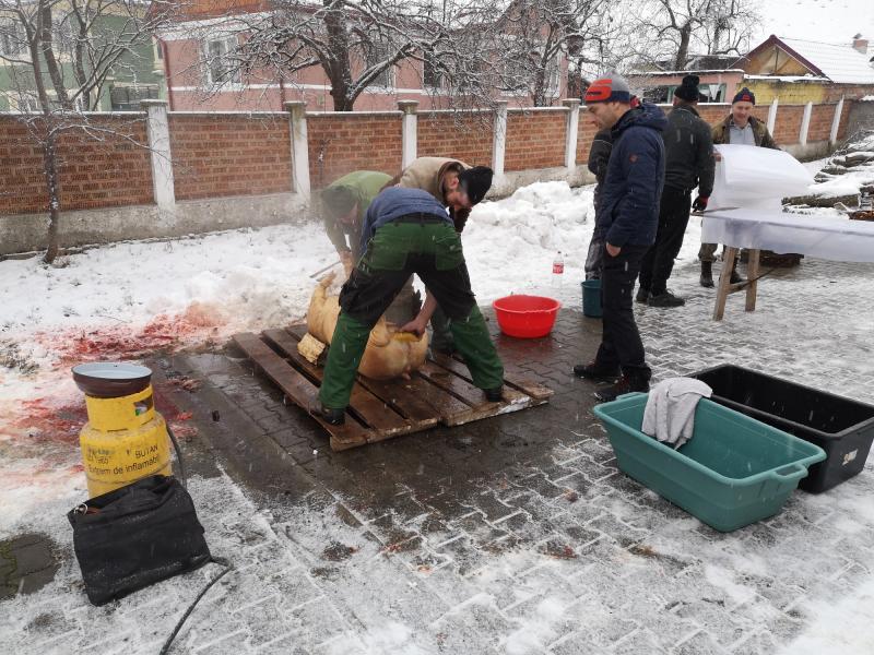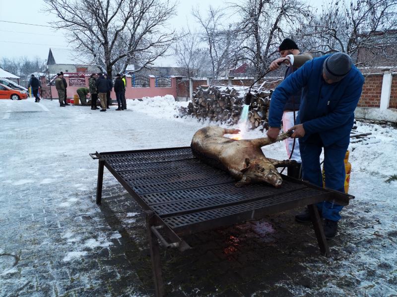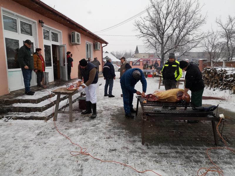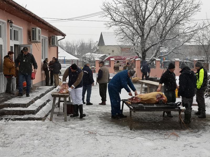 Aznap korán reggel érkeztem Datkra, Major László datki unitárius lelkész szívélyes, baráti meghívásának eleget téve, és akkor a szorgos böllérek a kultúrház udvarán már elkezdték a két koca perzselését. Az egyiket a helyi, a másikat a pusztaföldvári férfiak kezdték gondosan bontani, ezután a hús-, és szalonnarészek a konyhára kerültek az asszonyokhoz. Utoljára gyerekkoromban, anyai nagyszüleim Felső-Tisza menti falujában láttam disznóvágást, így számomra is érdekes volt megfigyelni a különbségeket, és a hasonlóságokat a feldolgozási folyamatban. A hozzávalókat közadakozásból a falu közössége, és vezetése biztosította, például 25 házikenyeret süttettek Olthévízen a községközpontban, a savanyúság a falu spájzaiból, kamráiból került az asztalokra.