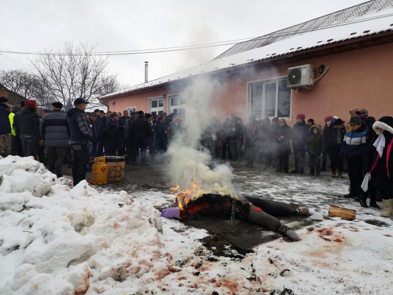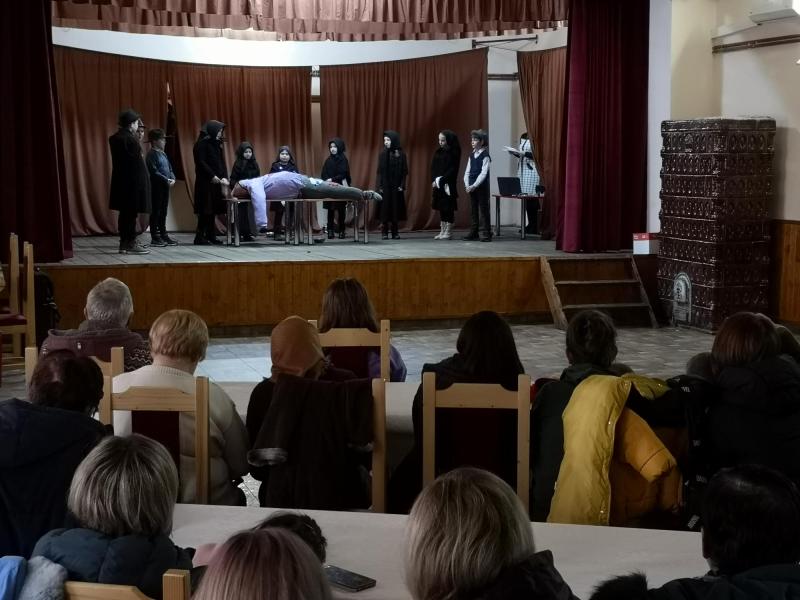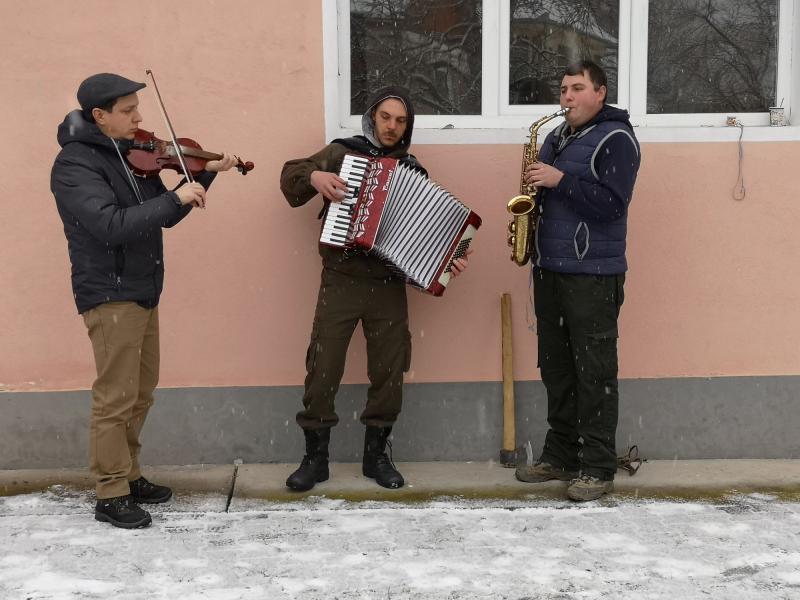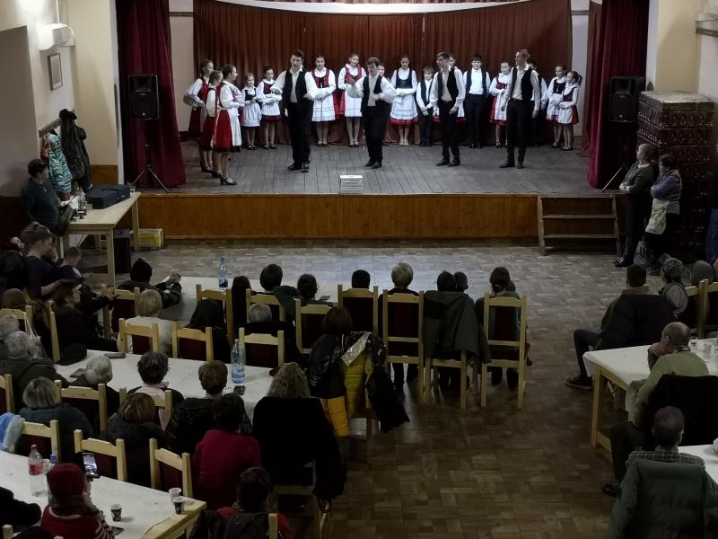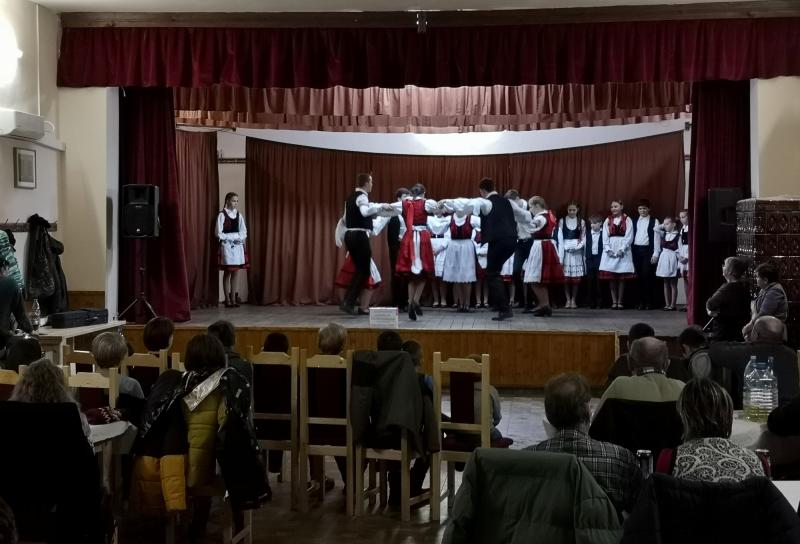 A helyi elemi iskolások télűző előadása után, miután tisztességesen elsiratták a vén Dobait, aki hogy, hogy nem, minden évben ilyenkor szokott távozni az élők sorából, a disznóperzselés helyén, a művelődési ház udvarán a bábut is elégették. Késő délután érkezett az Oltovány néptáncegyüttes Olthévízről, olthévízi általános iskolások, és köztük datki gyerekek, akiket László Ildikó, és László Zsolt rugonfalvi néptánc pedagógus házaspár készített fel. A szülők, nagyszülők, közeli, és távolabbi rokonok, falubeliek és meghívottak büszkén nézték a gyerekek táncos előadását, sok-sok okostelefon emelkedett homlokmagasságba, hogy felvételt készítsenek. Folyton oda kellett figyelnem, hogy ne álljak a feltartott telefonok elé, ne álljak a képbe, miközben fotózok. Most sem tudtam elkerülni a szindbádi nosztalgia kissé elérzékenyítő érintését, és önkéntelenül eszembe jutottak ezekről az ügyesen táncoló, és éneklő erdélyi gyerekekről azok az emlék -és pillanatképek, amikor hetedikes, és nyolcadikos korunkban mi is hasonló koreográfiával léptünk fel Nyíregyházán, Nagykállóban és a kárpátaljai Nagyszőllősön. Az itteni gyerekek is táncoltak szatmárit, például a botforgatóst, a botolóst mi is tanultuk anno az egykori alma materben, annál is inkább, mert mi akkor úgymond otthon voltunk, hiszen ez tánc a mi szülővidékünkről származik, a Felső-Tisza, a Nyírség, Szatmár-Bereg vidékéről.