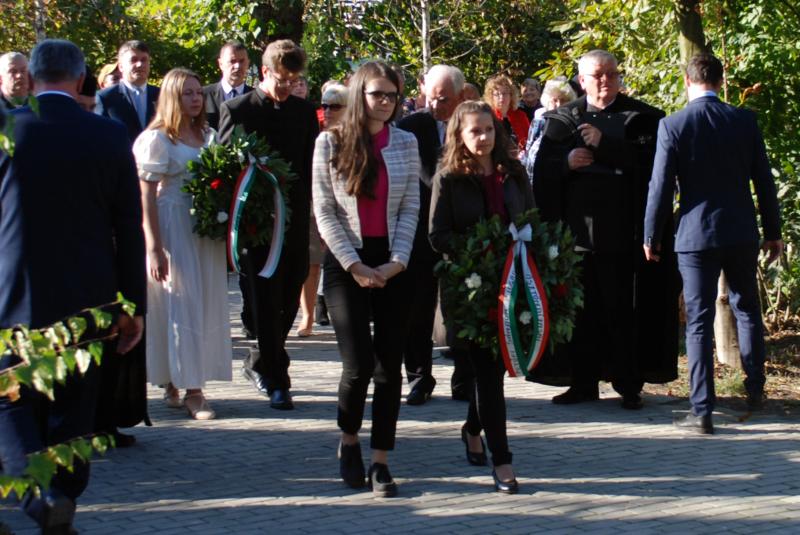 A templomi ünnepség után a templom kertjében található emlékműnél emlékeztek meg a háborúk és 1956 áldozatairól, majd dr. Grezsa István miniszteri biztos, Soós Zoltán csíkszeredai konzul, illetve Ugron-Szekeres Villő és Nagy Emese, a Petőfi Sándor Program ösztöndíjasai, valamint a helyi fiatalok megkoszorúzták azt. A három, nemzeti szalagos koszorú elhelyezése után, az emlékmű mellé fenyőfát ültettek, majd fogadással, kötetlen beszélgetéssel és a Bíborka Néptáncegyüttes fellépésével zárult a a színvonalas esemény.