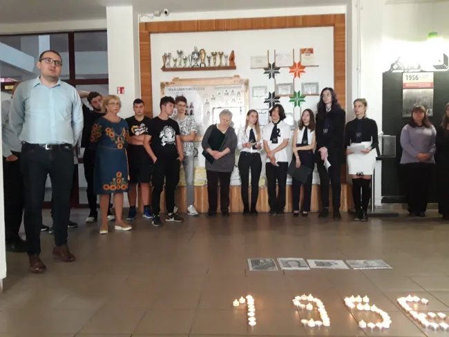 A történelmi események felelevenítését követően égő mécsesekből raktuk ki közösen az 1956-os évszámot, majd a forradalom emlékét őrző verseket szavaltak a diákok. A versek közül elhangzott az erdélyi származású Bartis Ferenc "Utószó" című költeménye, melyet követően a szerzőt 7 év börtönbüntetésre ítélték. Képek bemutatásával név szerint is megemlékeztünk a forradalom néhány ifjú áldozatáról. A szabadságharcosoktól kevéssel idősebb fiatalok harcoltak a szabadságért.