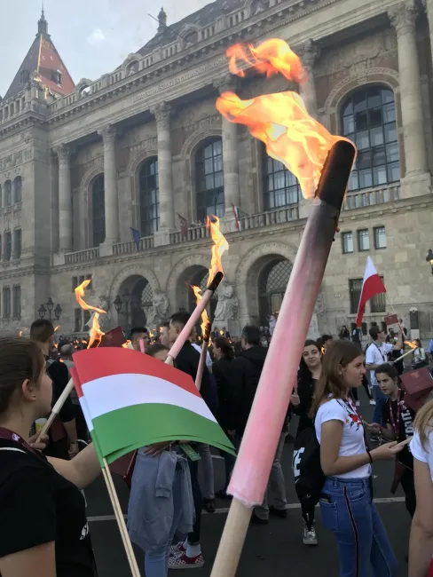 Utazásunk első megállója a Lakiteleki Népfőiskola volt. Mindannyian elfoglaltuk a szálláshelyünket, megebédeltünk, s felkészültünk a budapesti útra. Délután 3 órakor csatlakoztunk a Budapesti Műszaki Egyetem előtt a megemlékező diákokhoz. Itt tudatosult a fiatalokban, hogy első ízben találkozhatnak a világ magyarságával, hiszen voltak itt a Kárpát-medence minden régiójából és még az óceán túlról is, szórványból és diaszpórából középiskolások és egyetemisták. A fáklyás felvonulás előtt szem- és fültanúi lehettünk a Műegyetem aulájában zajló 1956-os emlékünnepségnek, melyet az egyetem előtt kihelyezett óriáskivetítőn nézhettünk végig. Az emlékünnepség végéhez érve a Rákóczi Szövetség fiatal aktivistái már osztották a fáklyákat és a magyar zászlókat. „Felfegyverkezve” elindult az ünneplő diáksereg a Bem térre. Az, hogy több ezer határon túli fiatallal közösen indulhattunk útnak ezen a felvonuláson, már az is felemelő élmény volt számunkra. Mi is megtettük azt az utat, melyet 1956-ban azok a bátor fiatalok, akik az orosz megszállók ellen fogtak fegyvert és vonultak a pesti utcára. A Bem téri koszorúzást követően visszamentünk a buszokhoz és elindultunk a MOM Sportközpontba, ahol részt vettünk a Rákóczis Légy-Ott! középiskolás találkozón, majd a Bagossy Brothers Company koncertjével ért véget kalandos napunk.