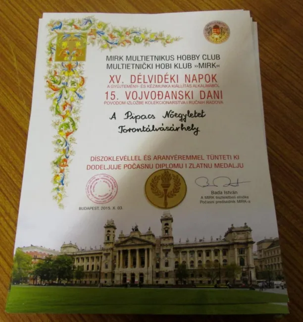 A teadélután alkalom volt a házigazda nőegylet legutóbbi díjának méltatására is. Október elején a Budapesten megtartott XV. Délvidéki Napok keretében ugyanis a torontálvásárhelyi kézimunkázó asszonyokat is díjazták a MIRK Multietnikus Hobby Club működtetői. A Fekete Ilonka, Csanki Rozália, Nagy Éva, Kolinger Ilona, Balogi Rozália, Kiss Ilona, Kiss Rozália, Fábián Mária, Becsei Katalin, Borbás Eszter és Alföldi Eszter felállású csapat az Aranytű díjat vehette át. A zenét Győri Zoltán és Becsei Károly zenészek szolgáltatták, advent első vasárnapját a gazdag és ötletes tombola nyeremények kisorsolásával zárták.