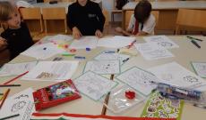 Nagyon jó hangulatban telt el a játékos foglalkozás is, amely természetesen a gyerekek életkorához igazodott. A kicsik hatalmas lelkesedéssel színeztek-festettek. A nagyobbak már egy röpke tudásfelmérőt is kaptak, illetve állatokkal kapcsolatos keresztrejtvényt kellett megoldaniuk. Kiváló csapatmunka folyt, és a megérdemelt állatos matrica, illetve csoki sem maradt el jutalmul. A program végén közösen megnéztük a Magyar népmesék Tréfás farkas című epizódját.