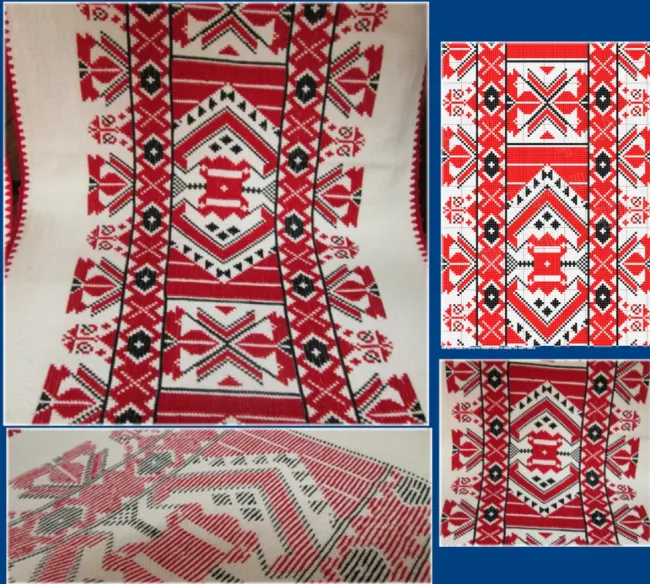A régi vászon szövéséhez lent, kendert és gyapotot használtak, amelyből lepedőt, párnavéget, takarót, inget készítettek. A darabok összeállításához, valamint az abroszok, terítők szegélyezéséhez horgolt csipkét vagy rojtot használtak. A varrottasok alapanyaga, a vászon, melynek a szálai jól számolhatók. A használt keresztszemes hímzési technikát a megoldása alapján „szálán varrott” vagy „zsinórhímzésnek” nevezik. Szigorú szabály, hogy a régi minta szerint és eredeti színnel készüljön. A gazdag, változatos mintakincsre jellemző a rendszer, szimmetria, ismétlés, harmónia és szimbolika. A formavilág geometrikus, gyakran használt motívumok a stilizált levelek, virágok vagy madarak (,,cserleveles, fenyőgallyas, tulipános,, vagy más megnevezésekkel). A mértani motívumok a mindennapokban használatos megnevezésekkel vannak ellátva (,,almás, csillagos, tányéros, szíves, kőrózsás, vasrózsás,,). A varrottasok színvilága szabály szerint egy, illetve kettő, azaz piros, fekete, kék vagy piros-fekete, piros-kék kombináció alkalmazásával. A terítőknél, abroszoknál a minta középrészét, a főmotívumot alul-felül az úgynevezett „mesterín” szegélyezi, erre helyezik az egyforma távolságra a „mesterkét”. A mesterke, függetlenül a középrész mértani vagy stilizált növénydíszes mintájától, legtöbb esetben szabályosan ismétlődő virág- vagy levéldíszítmény. Kisebb munkán, alátéten, tarisznyán kimaradhat a mesterke motívuma.