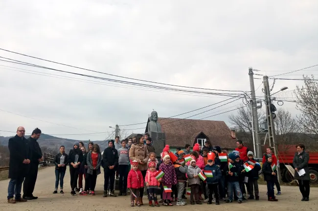 Az elmúlt napokban, ha az iskola falai között jártunk, már kihallatszott az ajtók mögül néhány Kossuth-nóta dallama. Az ovisok, felső- és alsó tagozatos tanulók egyaránt versekkel, dalokkal készültek az 1848-49-es forradalom tiszteletére, illetve a nagyobbak a Pilvax kávéházban történteket és a „12 pontot” elevenítették fel. E mellett ügyes kezek készítette csákók, párták, zászlók és kokárdák is kivonultak pénteken a falu központjába. A tanárok és diákok évek óta szereznek meghitt pillanatokat az apró magyar falu lakóinak, hiszen a megjelent egyházi vezetőkkel és a helyi lakosokkal együtt ünnepelnek. Március idusára emlékezve a felső tagozatban együtt néztük meg az Utolsó órák című filmet, melynek kapcsán felidéztük a történelemórákon a forradalomról tanultakat is.