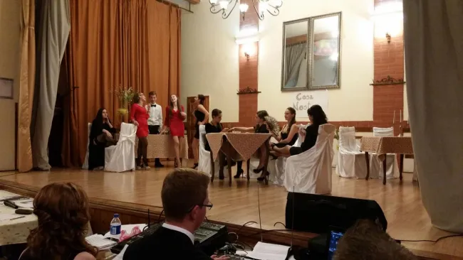 A tanárok is készültek egy kis műsorral, ez már a gólyabál elmaradhatatlan része. Természetesen az erre való felkészülés is titokban zajlott. Picit kötődött a diákok színdarabjához. A líceum tanárai úgy vélték, hogy ne csak a 9.-es diákokat tegyék próbára, hanem egy másik, újonnan érkezőt is, engem, a Petőfi Program ösztöndíjasát. Részt vehettem naponta, minden este, sokszor az éjszakába nyúló próbákon, és egy nagyon jó csapat tagja lehettem, mely sok nevetéssel is járt. Mi is készültünk tánccal, és az elmaradhatatlan énekkel, ami számomra már kötelező volt. Felcsendült az Elisabeth musicalből Sissi dala és a My Fair Lady egyik legismertebb dalára, a Ma éjjel táncolnék című dalra táncolt a teljes tanári kar báli ruhában bécsi keringőt. A tánc látványos volt, melyre Nora Loanovici tanárnő készítette fel a fellépőket. Nóra tanárnő 40 éven át hivatásszerűen táncoktató volt, táncosai komoly eredményeket értek el nemzetközi és európai táncversenyeken. Köszönjük neki a fáradságos munkát, a gyönyörű koreográfiát, aki hihetetlen energiáival, aktivitásával, belülről fakadó eleganciával volt jelen a próbákon, és kihozta a csapatból a maximumot.