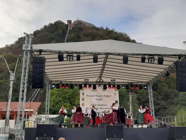 Ezen a vidéken az ősz nem múlhat el a Hunyad Megyei Magyar Napok nélkül. A tíz napos, színvonalas programokkal tarkított rendezvénysorozaton táncosaink Déván és Vajdahunyadon is felléptek, ahol nagy sikert arattak. Kíváncsian figyeltük a velünk egy színpadon fellépőket, Hunyadon például a Bekecs táncegyüttes remek műsorát, Déván a bukovinai dalokat éneklő felnőtt kórust, a reneszánsz táncbemutatót, vagy a Szent Ferenc Alapítvány táncosait. Külön öröm volt számomra, hogy itt Szabó Annamária, a Petőfi Sándor Program ösztöndíjasa konferált.