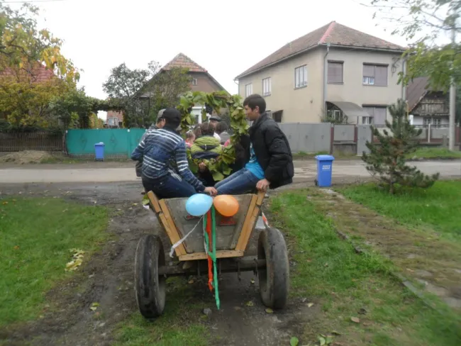 A mulatozást és a játékokat közös énekléssel kezdtük: a kocsin énekelt szüreti dalokból tanítottunk párat az érdeklődőknek, hátha jövőre legalább még két kocsit el tudunk indítani a felvonuláshoz. A népdalok után a Beregrákosi Vadrózsák, a magyar általános iskola felső tagozatos táncosai tartottak rövid bemutatót az eddig tanultakból, és egy villám táncházat is rögtönöztek ízelítőként az esti tánctanításhoz.