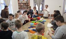 A délután most is két teremben, egymással párhuzamosan zajlott. Míg a kézműves szobában a csendesebb alkotás zajlott, házigazdánk, a Körtvélyfájai Bokréta Néptánccsoport tükrös próbatermében Bíró Júlia vezetésével néhány farsangra hangoló dal közös eléneklése után egyenesen a farsangi alakoskodók birodalmába csöppenhettünk közös játékokkal és dalokkal: volt ott barlangjában alvó medve, akit a gyerekeknek kellett felébreszteniük, és mocsárban vadászó gólya is, aki elől a békáknak el kellett bújniuk.