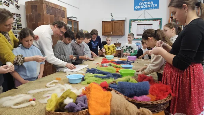 Saját feladatom ezen a napon a kézműves szobába, a nemezelő asztalhoz szólított, ahol Kiss Andorral és Verával közösen ez alkalommal (a programsorozatunkban először) a nemezelés rejtelmeibe vezettük be a gyerekeket. Ez a folyamat, a közös alkotás is maga a csoda: látni, ahogy a száraz, színes gyapjúcsíkok a szappanos-vizes simogatás, a tenyérben való türelmes sodrás, majd a határozott, tömörítő mozdulatok hatására a legapróbb kezekben is különböző színű nemezelt, tömör kis golyóbisokká formálódnak.