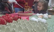 A délután folyamán a fiatalabb korosztály, a Kikerics Néptáncegyüttes tagjai kapcsolódtak be az ünnepi készülődésbe. Ez alkalommal is a kézművesség állt a középpontban: Hortenzia a hagyományos tojásírás technikáját mutatta be, különféle népi motívumokat is megismertetve a résztvevőkkel. Én is folytattam a makramézást – ezúttal a gyerekekkel, akik lelkesedéssel és ügyességgel vetették bele magukat az alkotásba.