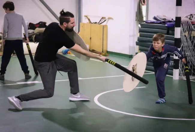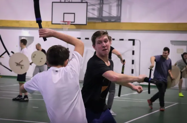 A foglalkozások botos ritmusos ügyességi játékokkal kezdődtek, amelyek egyrészt a kétkezes eszközhasználatot csiszolták, másrészt a két kézre, és a szemben álló ellenfélre való összpontosított figyelmet, a szemünk sarkából látást gyakoroltatták. Ezen felül a közösséget is összerendezte ez a gyakorlat, s egy ritmusban tudtunk mozdulni. Később ezekre a készségekre építettünk. A továbbiakban volt botos kidobó, pajzsos-botos kidobó és ennek kis egységes harcászati változata, mikor egy 2-3 fős csapatnak egymást kell megvédenie a labdák záporától. Csoportbontásban foglalkoztunk késharccal és szablya-pajzs vívással is. Csoportos küzdelmekkel, csatákkal zártuk az órákat. A nagyedzésen tappancsos nyílvesszőkkel íjjal én is beszálltam, és ezzel még több taktikázást vittem bele a játékba.