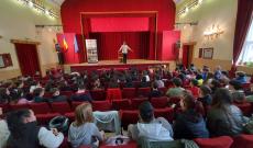 A versvándor délután egytől kezdődő, a szászrégeni Petru Maior Könyvtárban tartott előadásával már az Alexandru Ceușianu iskola felsős, magyar tagozatos diákjaihoz szólt. „Vasútállomás” című pódiumműsorában mesélt az árvaságból, a mélyszegénységből kitörni vágyó fiatal, József Attila küzdelmes életéről, az első szárnypróbálgatásairól, a középiskolás és egyetemi éveiről: arról, hogy ez a szeretetre és szeretni vágyó fiatalember hogyan akarta tanulással, szorgalommal, kitartó munkával, tiszta szívvel, hittel a szívében megváltoztatni az életét.