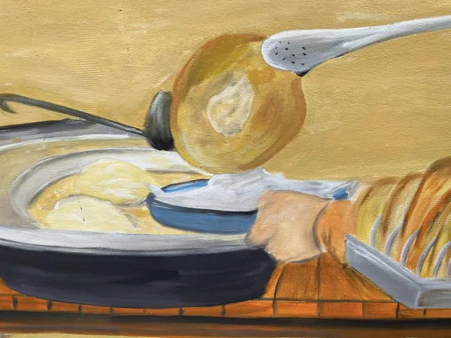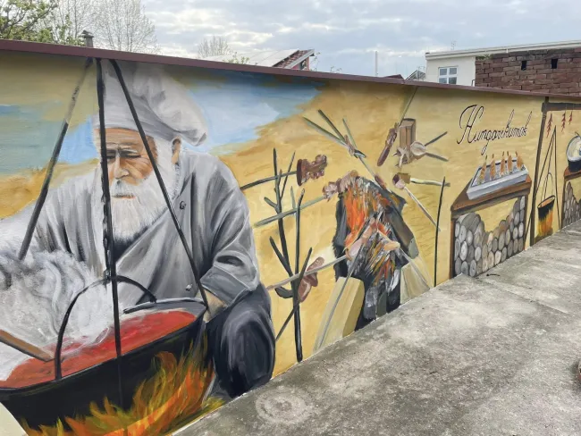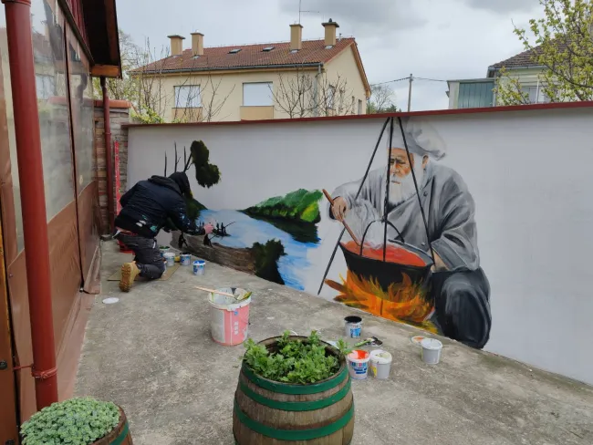 Az udvar ezen része is fontos az egyesületnek, hiszen ezen a kis zöld területen zajlanak a szabadtéri sütések-főzések. Ezért döntöttek úgy a tagok, hogy falfestményen is megjelenítik azokat a hagyományos magyar ételeket és tevékenységeket, amiket annyira szeretünk.