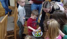 Keveváron nagy örömünkre hét gyerek jött el a foglalkozásra. Sikerült sok nyuszival kapcsolatos éneket közösen megtanulni és néhány ablakdíszt is készíteni a plébánia ablakaira.