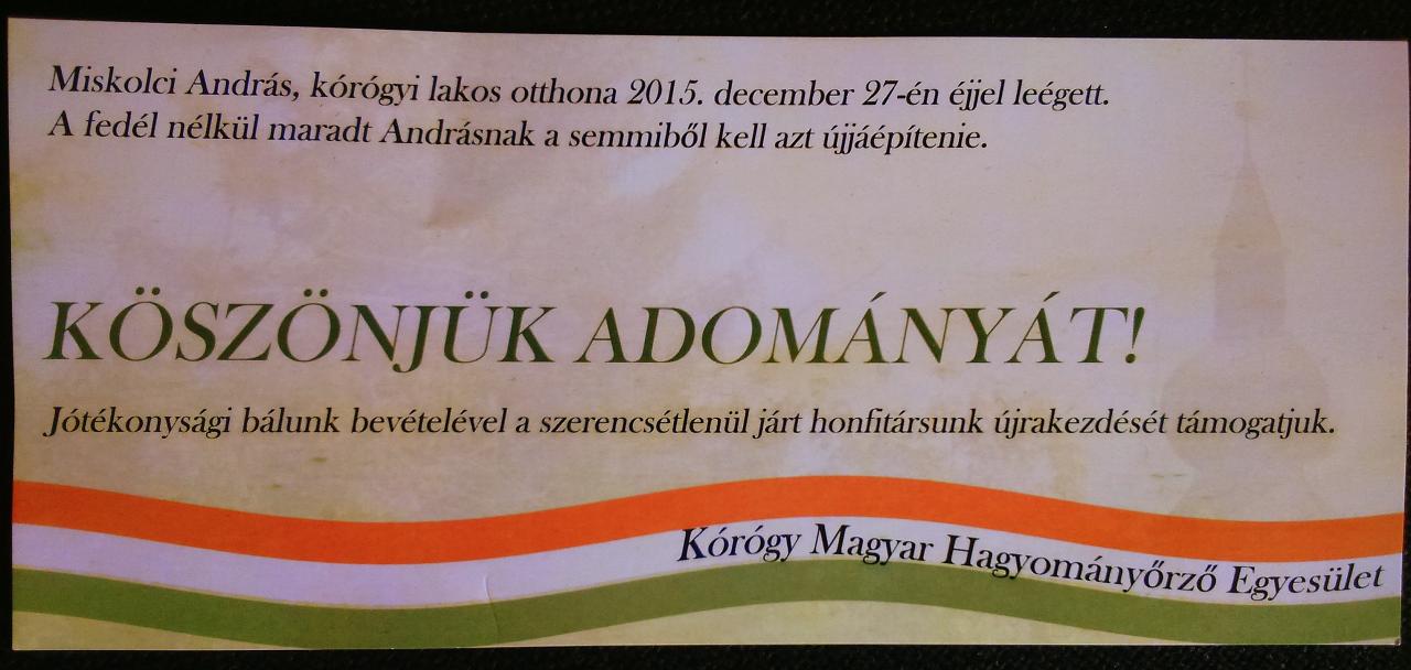 A Kórógy Magyar Hagyományőrző Egyesület január 30-ára szervezte meg a helyi, szokásos farsangi batyubált. Idén ez az esemény jó alkalom volt arra, hogy Miskolci András kórógyi lakos számára gyűjtést szervezzenek, akinek 2015. december 27-én leégett a családi háza.