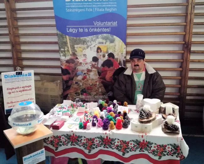 2017. december 10-én a szászrégeni 2-es iskola tornatermében mutathattuk be, milyen sok ajándéknak valót készítettünk a Diakónia nappali foglalkoztatójában. A fiatalok már hetek óta azon szorgoskodtak, hogy fonalból és papírból mindenféle színes és ízléses "árut" állíthassunk elő erre az alkalomra. A karácsonyfadíszek, adventi koszorúk és képeslapok jól illettek a többi árus asztalán illatozó sütemények és házi készítésű illatszerek közé. A vásárlók sokféle különleges portékából válogathattak: kézimunkák, méz, újrahasznosított papírból varázsolt ékszerek csalogatták az érdeklődőket.