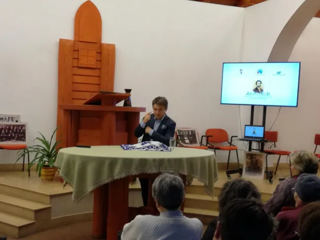 Ismerősként köszöntöttük a vendéget, mert ahogyan Böjte Lídia tanárnő a bemutatás során elmondta, a két líceum és az általános iskolák magyar tagozatos diákjai találkozhattak vele az elmúlt évben rendhagyó irodalomórán. A meghirdetett program gazdagabb lett a vártnál, a vendég ugyanis egy 2017-ben készült felvétellel érkezett: levetítette azt az Arany-évre készített rövidfilmet, melyben a költő pályafutásának legfőbb állomásait veszi sorra. Az Országos Széchényi Könyvtár kézirattárában található a Toldi estéje 1853-ban keletkezett variánsa, mely Szent László legendáját is tartalmazza.