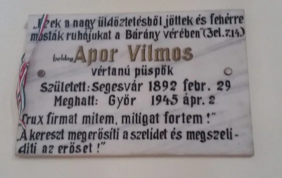 71 évvel ezelőtt, 1945. április 2-án, Nagypéntek napján lőtték le Apor Vilmos, segesvári születésű püspököt. A megszálló szovjet katonáktól védelmezett meg 3 fiatal lányt az erőszaktól, majd lányokat, asszonyokat, gyermekeket védve állta el a pincébe vezető utat Győrben, ahol 3 halálos golyót kapott. A titkára kérdezte, hogy érez-e fájdalmakat. Válasza az volt: „Hálát adok Istennek, hogy ilyen szép nagypénteket adott.” A jelen lévő nővéreknek azt mondta: „Ha megmenekül minden nő, akkor érdemes volt!” Állapota Húsvét vasárnapra, április 1-jére válságosra fordult. Ekkor meggyónt, felvette a szentkenet szentségét, majd mindenkit megáldott. Utolsó mondata halála előtt így szólt: „Felajánlom szenvedéseimet az egész magyar hazáért és az egész világért. Szent István, könyörögj szegény magyarokért!”