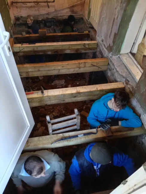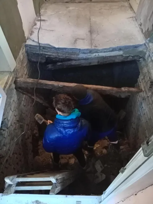 Az első lépés a régi padló maradványainak lebontása volt. Az omladozó téglák és elkorhadt deszkák a használaton kívüli pincébe kerültek, ezzel megtisztítva a területet az új szerkezet építéséhez.