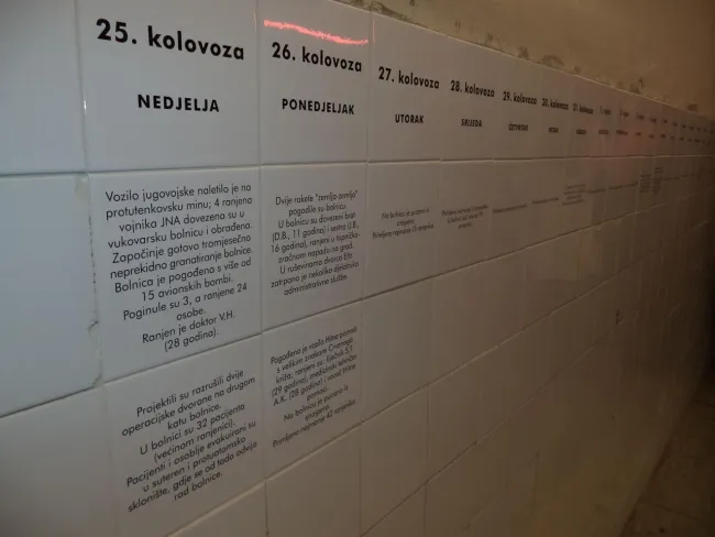 Vukovár szimbólummá vált a háború alatt elszenvedett tragédiái miatt. A város számos helyen viseli a szenvedés nyomait, mind a térben, mind a szívekben. 1991-ben Horvátországot megtámadta a Jugoszláv hadsereg, Vukovár augusztus 25-től november 18-ig volt ostrom alatt. Elsőként a Kórház Múzeumba, az emlékezés helyére látogattunk, ahol korabeli videó felvételeken, híradós adásokon, interjúkon keresztül nyerhetünk bepillantást a történtekbe. A kórház földszintjén és az alagsorban a sebesültek ellátására szolgáló termekben kiállítást találunk, mely az egykori felszereltséget és a betegek reménytelen helyzetét tárja elénk. A falon a háború naplója és az elhunytak nevei szerepelnek. A kórház katonai célpont volt, naponta több ezer találat érte. Az orvosoknak és ápolóknak vezetékes víz nélkül, egyre csökkenő gyógyszerkészlettel és felszereléssel kellett ellátniuk a háborús sebesülteket, civileket.