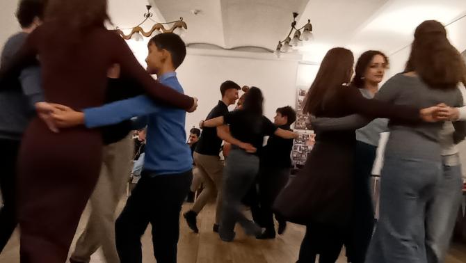 A tánccsoportok műsora után megkezdődött a moldvai, felcsíki, gömöri és széki táncok oktatása, a talpalávalót ezen is a BAJKÓ zenekar húzta. Közben, örömünkre, megérkezett és bekapcsolódott az eseményekbe Kilyénfalvi Gábor, a Délibáb Bécsi Magyar Kultúregyesület művészeti vezetője is, aki jelentős segítségére volt a linzi közösségnek e táncházi alkalom előkészítésében.