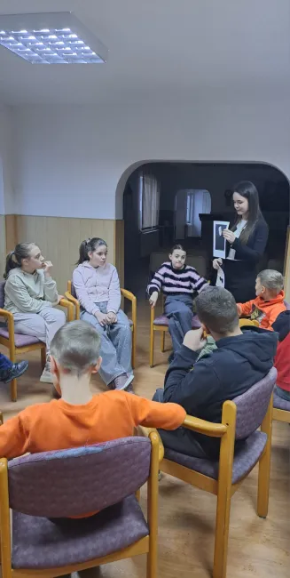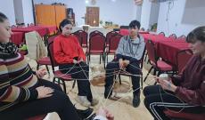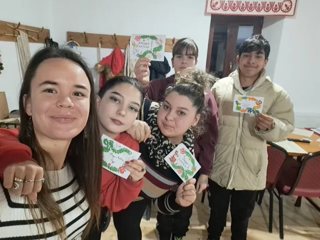 A foglalkozásokat a nyelvünk és motívumaink gazdagságának kihangsúlyozása köré építettem. Így született meg bennem az ötlet, hogy a „Hálót sző a pók” játék mintájára mondjuk el egymásnak kedvenc magyar szavainkat. Ehhez egy gombolyagot használtunk, amit egymásnak adogatva egy pókháló formát alakítottunk ki. A játék végeztével felidéztük egymás kifejezéseit, visszatekerve a fonal szálait. Az elhangzottak között többek között a szeretet, imádság, kultúra, iskola, tél szavaink is szerepeltek. Ezeknél a tevékenységeknél mindig örömmel tölt el, hogy azok a gyerekek is megszólalnak, akik pár hónapja még egyáltalán nem beszéltek magyarul. A foglalkozásokon mindemellett képeslapokat is készítettünk. A gyerekek a magyar népmesék legismertebb motívum mintáját színezhették ki. Ezek hátulját megcímezhették, és kedves gondolatokkal egészíthették ki.