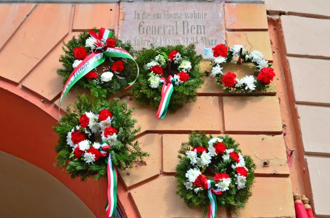Délben a város központjában, a Bem József-emléktáblánál ünnepi műsort és koszorúzást tartottak, szép számú megemlékező közönség részvétele mellett. A felszólalók közül először Ambrus Izabella parlamenti képviselő, majd Tóásó Imelda, Brassó Megye Tanácsa alelnöke mondott beszédet. Folytatásként Szente László, volt városi tanácsos tartott rövid előadást a Bem-plakett történetéről és Bem apó életéről, melyből sok más mellett kiderült, hogy Bem tábornok a Czeides-ház erkélyéről – Brassó műemlék épülete, amelynek homlokzatán az emléktábla áll – olvasta fel a brassói kiáltványt 1849. március 21-én: „Magyarok, szászok és románok! Nyújtsatok egymásnak testvéri jobbot, távoztassatok minden nemzeti gyűlölséget, és boldogok lesztek.” Az emléktáblát 1895-ben helyezték el az épületen, amelyet az 1930-as évek végén a vasgárdisták eltávolítottak. 2002-ben aztán megtalálták a Brassó Megyei Történeti Múzeum gyűjteményében, s 2008-ban visszahelyezték az épületre. Az emlékünnepet színesítette az Áprily Lajos Főgimnázium harmadik osztályos tanulóinak előadása, akik forradalmi dalokat adtak elő, majd két középiskolás diák szavalt, Pál Imre tüzes szavalata után pedig a jelenlévő szervezetek és egyházak megkoszorúzták az emléktáblát. A emelkedett hangulatú rendezvény a Brassói Magyar Dalárda vezetésével elénekelt magyar és a székely himnusszal ért véget.