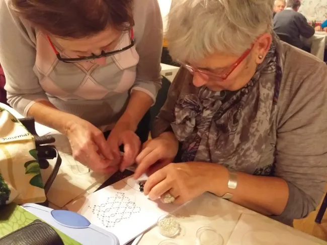 A vukovári asszonyokkal a népi gyöngyfűzés elemeire építjük alkotásainkat, mivel számtalan tájegység és annak stílusa létezik, ezért ki-ki képességeinek megfelelően fokozatosan halad a gyakorlásban. Először az egyszerű csiperke mintát sajátítottuk el, aztán a moldvai csángó tászli, kalotaszegi gyöngyszalag, somogyi cakkos, kis- és nagykrassói gyöngygallér varrása következett. Az ügyesebbek már a sárközi gyönyggallér és ukrán kriza tervezésével és elkészítésével foglalkoznak. Miközben folyamatosan az új mintákat keressük, a színek harmonizáló összeállításán dolgozunk, észre sem vesszük, hogy mennyire telik az idő, és szaporodik a láncunk.