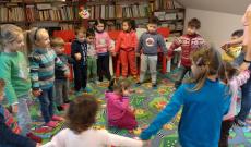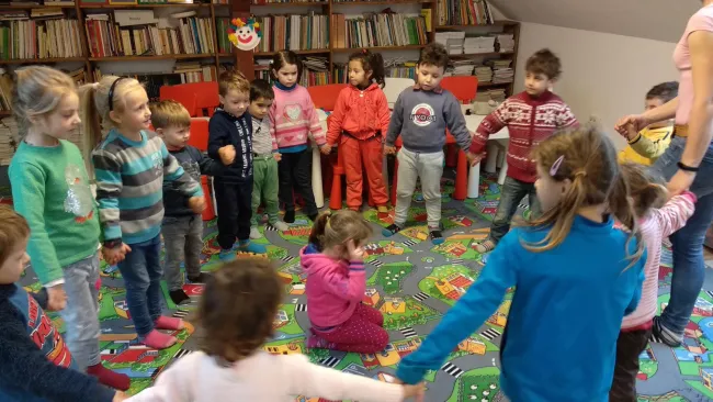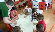 Januártól az ovisokkal ketten foglalkozunk, mert így is kihívást jelent a munka. Minden nap felmegyünk az állami óvodába és fél tizenegykor az ottani program végén felöltöztetjük a hozzánk tartozó gyerekeket és megpróbálunk viszonylag rendezetten levonulni a Magyar Házhoz. Ott sorban állunk, énekelve betekergünk és a kötelező mosdólátogatás után kezdődik a foglalkozás az oviban. A szülők fél egyre jönnek és viszik haza a csemetéket.