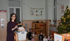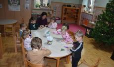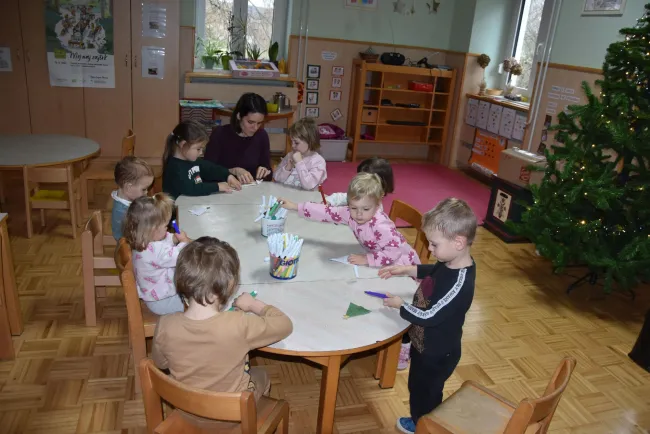 Karácsonyhoz közeledve Bartos Erika egyik meséjének, a Bogyó és Babóca mézeskalácsának diafilmes változatát vittem a gyerekeknek, melyet nagy örömmel hallgattak. Akik nem tudnak még magyarul örültek az ismerős szereplőknek. A csoportokban már állt a karácsonyfa, így a Kiskarácsony, nagykarácsony című dalt énekeltük, majd papírból hajtogatott, csodásan kiszínezett fákból girlandot készítettünk.